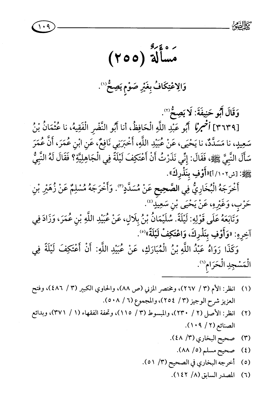 مَسْأَلَةٌ (255): وَالِاعْتِكَافُ بِغَيْرِ صَوْمٍ يَصِحُّ (¬1).