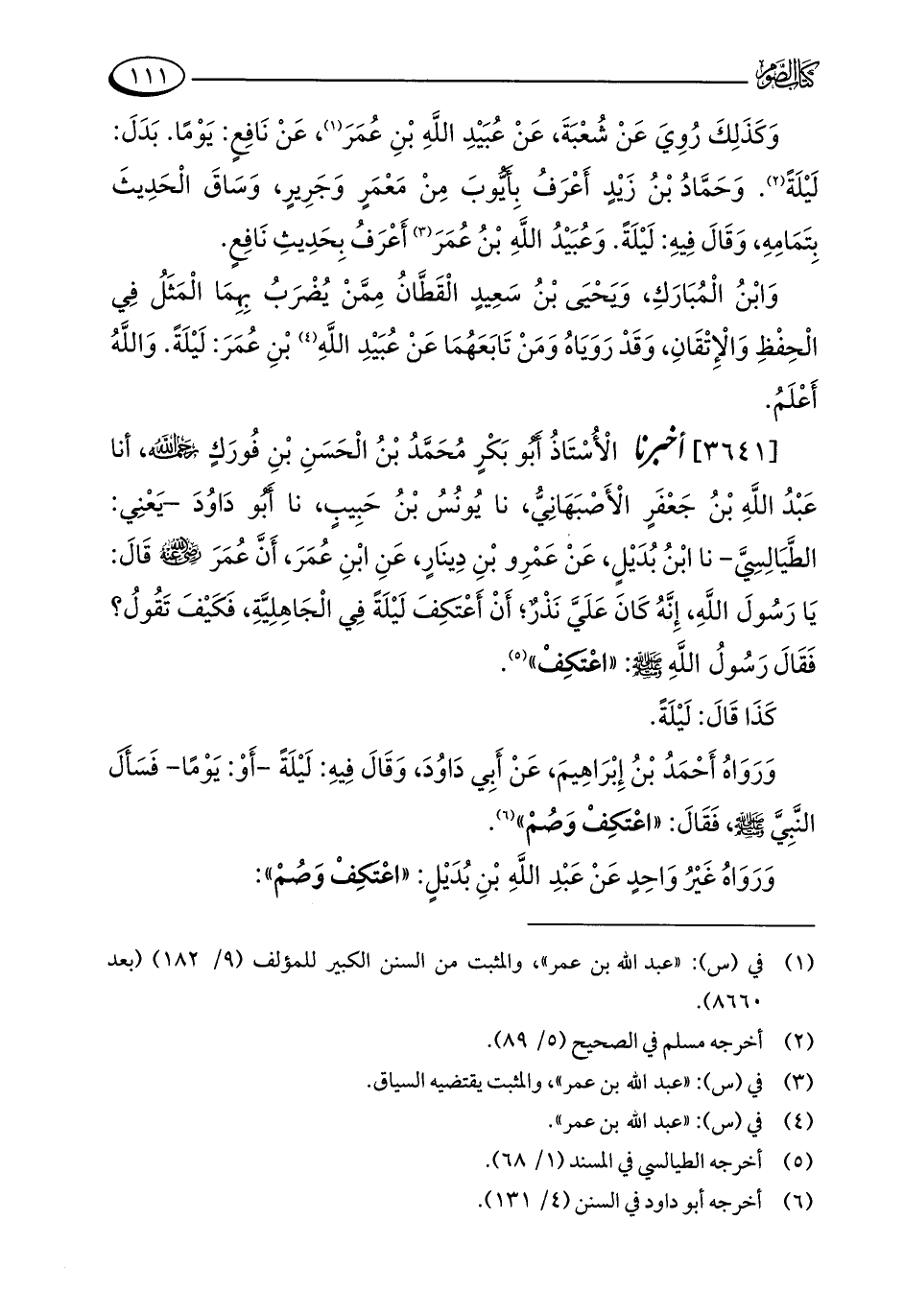 [3641] أخبرنا الْأُسْتَاذُ أَبُو بَكْرٍ مُحَمَّدُ بْنُ الْحَسَنِ بْنِ فُورَكٍ - رحمه الله -، أنا عَبْدُ اللَّهِ بْنُ جَعْفَرٍ الْأَصْبَهَانِيُّ، نا يُونُسُ بْنُ حَبِيبٍ، نا أَبُو دَاوُدَ - يَعْنِي: الطَّيَالِسِيَّ - نا ابْنُ بُدَيْلٍ، عَنْ عَمْرِو بْنِ دِينَارٍ، عَنِ ابْنِ عُمَرَ، أَنَّ عُمَرَ - رضي الله عنه - قَالَ: يَا رَسُولَ اللَّهِ، إِنَّهُ كَانَ عَلَيَّ نَذْرٌ؛ أَنْ أَعْتَكِفَ لَيْلَةً فِي الْجَاهِلِيَّةِ، فَكَيْفَ تَقُولُ؟ فَقَالَ رَسُولُ اللَّهِ - صلى الله عليه وسلم -: "اعْتَكِفْ" (¬5).