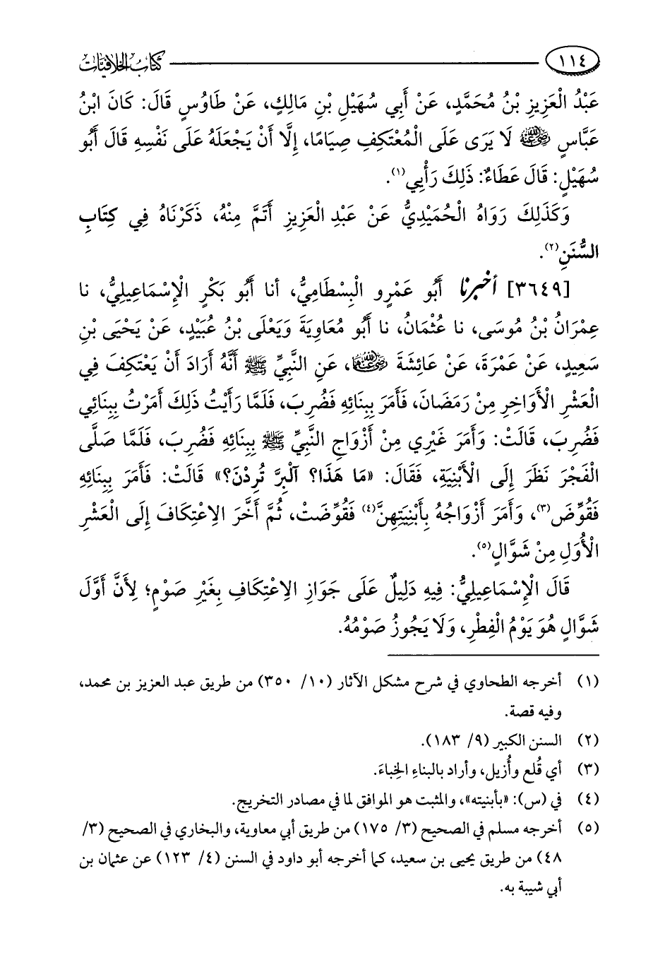 [3649] أخبرنا أَبُو عَمْرٍو الْبِسْطَامِيُّ، أنا أَبُو بَكْرٍ الْإِسْمَاعِيلِيُّ، نا عِمْرَانُ بْنُ مُوسَى، نا عُثْمَانُ، نا أَبُو مُعَاوِيَةَ وَيَعْلَى بْنُ عُبَيْدٍ، عَنْ يَحْيَى بْنِ سَعِيدٍ، عَنْ عَمْرَةَ، عَنْ عَائِشَةَ - رضي الله عنها -، عَنِ النَّبِيِّ - صلى الله عليه وسلم - أَنَّهُ أَرَادَ أَنْ يَعْتَكِفَ فِي الْعَشْرِ الْأَوَاخِرِ مِنْ رَمَضَانَ، فَأَمَرَ بِبِنَائِهِ فَضُرِبَ، فَلَمَّا رَأَيْتُ ذَلِكَ أَمَرْتُ بِبِنَائِي فَضُرِبَ، قَالَتْ: وَأَمَرَ غَيْرِي مِنْ أَزْوَاجِ النَّبِيِّ - صلى الله عليه وسلم - بِبِنَائِهِ فَضُرِبَ، فَلَمَّا صَلَّى الْفَجْرَ نَظَرَ إِلَى الْأَبْنِيَةِ، فَقَالَ: "مَا هَذَا؟ آلْبِرَّ تُرِدْنَ؟ " قَالَتْ: فَأَمَرَ بِبِنَائِهِ فَقُوِّضَ (¬3)، وَأَمَرَ أَزْوَاجُهُ بِأَبْنِيَتِهِنَّ (¬4) فَقُوِّضَتْ، ثُمَّ أَخَّرَ الِاعْتِكَافَ إِلَى الْعَشْرِ الْأُوَلِ مِنْ شَوَّالٍ (¬5).