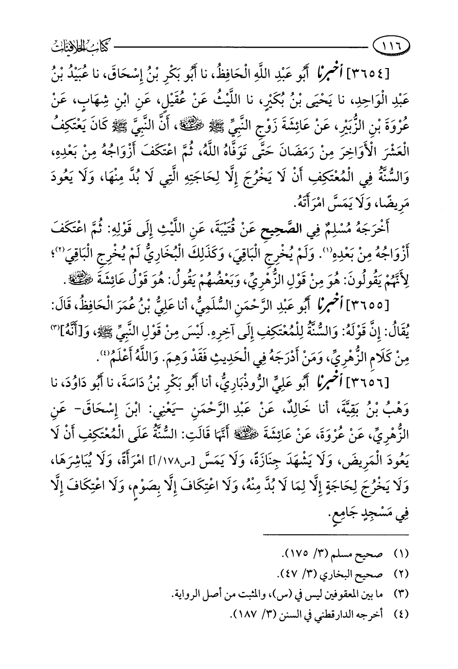[3655] أخبرنا أَبُو عَبْدِ الرَّحْمَنِ السُّلَمِيُّ، أنا عَلِيُّ بْنُ عُمَرَ الْحَافِظُ، قَالَ: يُقَالُ: إِنَّ قَوْلَهُ: وَالسُّنَّةُ لِلْمُعْتَكِفِ إِلَى آخِرِهِ. لَيْسَ مِنْ قَوْلِ النَّبِيِّ - صلى الله عليه وسلم -، وَ [أَنَّهُ] (¬3) مِنْ كَلَامِ الزُّهْرِيِّ، وَمَنْ أَدْرَجَهُ فِي الْحَدِيثِ فَقَدْ وَهِمَ. وَاللَّهُ أَعْلَمُ (¬4).