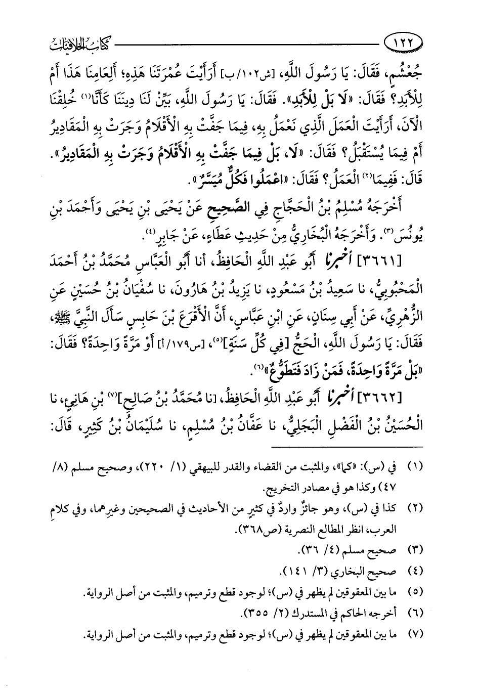 [3661] أخبرنا أَبُو عَبْدِ اللَّهِ الْحَافِظُ، أنا أَبُو الْعَبَّاسِ مُحَمَّدُ بْنُ أَحْمَدَ الْمَحْبُوبِيُّ، نا سَعِيدُ بْنُ مَسْعُودٍ، نا يَزِيدُ بْنُ هَارُونَ، نا سُفْيَانُ بْنُ حُسَيْنٍ عَنِ الزُّهْرِيِّ، عَنْ أَبِي سِنَانٍ، عَنِ ابْنِ عَبَّاسٍ، أَنَّ الْأَقْرَعَ بْنَ حَابِسٍ سَأَلَ النَّبِيَّ - صلى الله عليه وسلم -، فَقَالَ: يَا رَسُولَ اللَّهِ، الْحَجُّ [فِي كُلِّ سَنَةٍ] (¬5)، أَوْ مَرَّةً وَاحِدَةً؟ فَقَالَ: "بَلْ مَرَّةً وَاحِدَةً، فَمَنْ زَادَ فَتَطَوُّعٌ" (¬6).