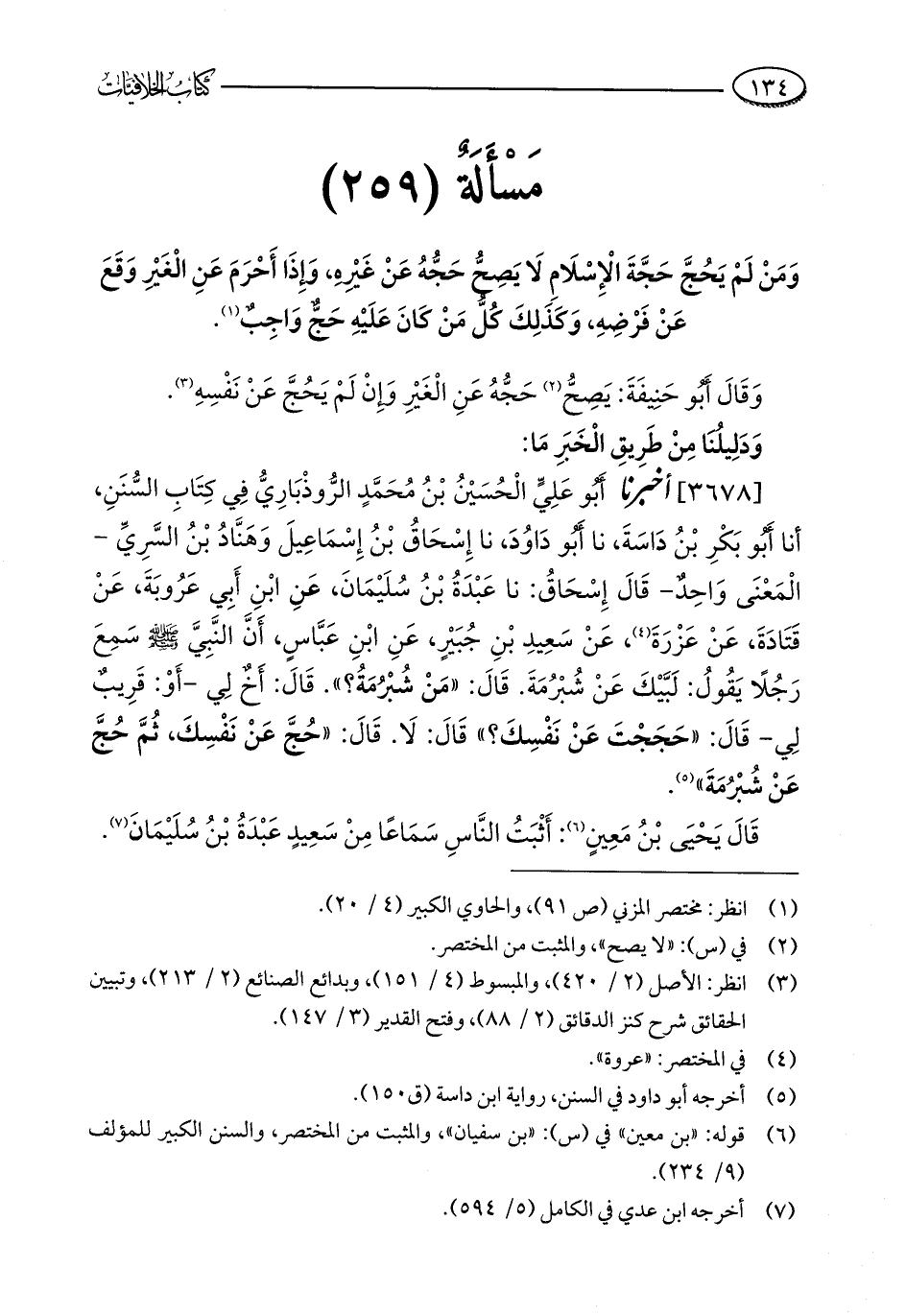 [3678] أخبرنا أَبُو عَلِيٍّ الْحُسَيْنُ بْنُ مُحَمَّدٍ الرُّوذْبَارِيُّ فِي كِتَابِ السُّنَنِ، أنا أَبُو بَكْرِ بْنُ دَاسَةَ، نا أَبُو دَاوُدَ، نا إِسْحَاقُ بْنُ إِسْمَاعِيلَ وَهَنَّادُ بْنُ السَّرِيِّ - الْمَعْنَى وَاحِدٌ - قَالَ إِسْحَاقُ: نا عَبْدَةُ بْنُ سُلَيْمَانَ، عَنِ ابْنِ أَبِي عَرُوبَةَ، عَنْ قَتَادَةَ، عَنْ عَزْرَةَ (¬4)، عَنْ سَعِيدِ بْنِ جُبَيْرٍ، عَنِ ابْنِ عَبَّاسٍ، أَنَّ النَّبِيَّ - صلى الله عليه وسلم - سَمِعَ رَجُلًا يَقُولُ: لَبَّيْكَ عَنْ شُبْرُمَةَ. قَالَ: "مَنْ شُبْرُمَةُ؟ ". قَالَ: أَخٌ لِي - أَوْ: قَرِيبٌ لِي - قَالَ: "حَجَجْتَ عَنْ نَفْسِكَ؟ " قَالَ: لَا. قَالَ: "حُجَّ عَنْ نَفْسِكَ، ثُمَّ حُجَّ عَنْ شُبْرُمَةَ" (¬5).