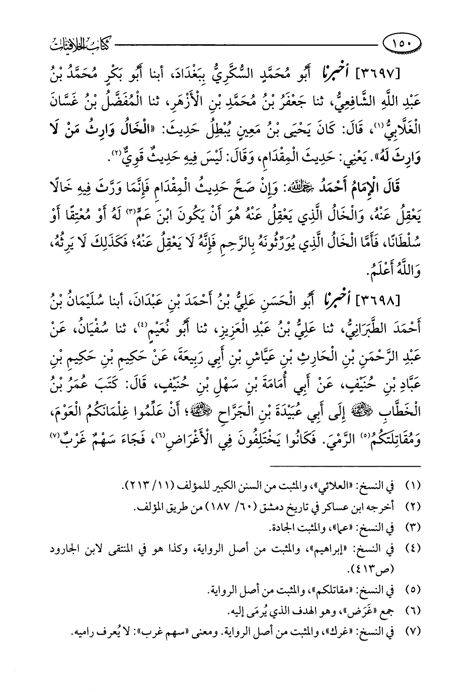 [3697] أخبرنا أَبُو مُحَمَّدٍ السُّكَّرِيُّ بِبَغْدَادَ، أبنا أَبُو بَكْرٍ مُحَمَّدُ بْنُ عَبْدِ اللَّهِ الشَّافِعِيُّ، ثنا جَعْفَرُ بْنُ مُحَمَّدِ بْنِ الْأَزْهَرِ، ثنا الْمُفَضَّلُ بْنُ غَسَّانَ الْغَلَّابِيُّ (¬1)، قَالَ: كَانَ يَحْيَى بْنُ مَعِينٍ يُبْطِلُ حَدِيثَ: "الْخَالُ وَارِثُ مَنْ لَا وَارِثَ لَهُ". يَعْنِي: حَدِيثَ الْمِقْدَامِ، وَقَالَ: لَيْسَ فِيهِ حَدِيثٌ قَوِيٌّ (¬2).