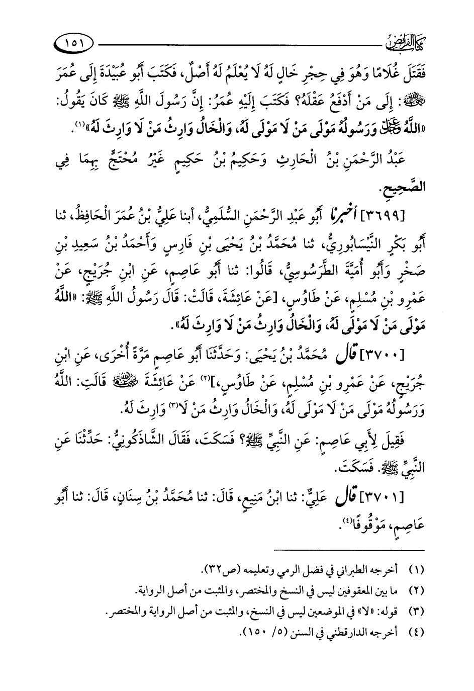 [3700] قال مُحَمَّدُ بْنُ يَحْيَى: وَحَدَّثَنَا أَبُو عَاصِمٍ مَرَّةً أُخْرَى، عَنِ ابْنِ جُرَيْجٍ، عَنْ عَمْرِو بْنِ مُسْلِمٍ، عَنْ طَاوُسٍ، ] (¬2) عَنْ عَائِشَةَ - رضي الله عنها - قَالَتِ: اللَّهُ وَرَسُولُهُ مَوْلَى مَنْ لَا مَوْلَى لَهُ، وَالْخَالُ وَارِثُ مَنْ لَا (¬3) وَارِثَ لَهُ.