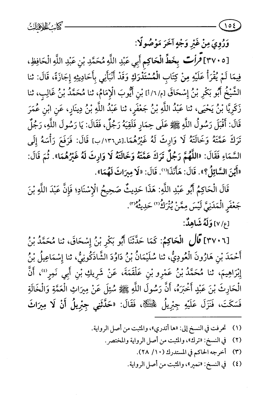 [3705] قرأت بِخَطِّ الْحَاكِمِ أَبِي عَبْدِ اللَّهِ مُحَمَّدِ بْنِ عَبْدِ اللَّهِ الْحَافِظِ، فِيمَا لَمْ يُقْرَأْ عَلَيْهِ مِنْ كِتَابِ الْمُسْتَدْرَكِ وَقَدْ أَنْبَأَنِي بِأَحَادِيثِهِ إِجَازَةً، قَالَ: ثنا الشَّيْخُ أَبُو بَكْرِ بْنُ إِسْحَاقَ بْنِ أَيُّوبَ الْإِمَامُ، ثنا مُحَمَّدُ بْنُ غَالِبٍ، ثنا زَكَرِيَّا بْنُ يَحْيَى، ثنا عَبْدُ اللَّهِ بْنُ جَعْفَرٍ، ثنا عَبْدُ اللَّهِ بْنُ دِينَارٍ، عَنِ ابْنِ عُمَرَ قَالَ: أَقْبَلَ رَسُولُ اللَّهِ - صلى الله عليه وسلم - علَى حِمَارٍ فَلَقِيَهُ رَجُلٌ، فَقَالَ: يَا رَسُولَ اللَّهِ، رَجُلٌ تَرَكَ عَمَّتَهُ وَخَالَتَهُ لَا وَارِثَ لَهُ غَيْرُهُمَا. قَالَ: فَرَفَعَ رَأْسَهُ إِلَى السَّمَاءِ فَقَالَ: "اللَّهُمَّ رَجُلٌ تَرَكَ عَمَّتَهُ وَخَالَتَهُ لَا وَارِثَ لَهُ غَيْرُهُمَا". ثُمَ قَالَ: "أَيْنَ السَّائِلُ؟ ". قَالَ: هَأَنَذَا (¬1). قَالَ: "لَا مِيرَاثَ لَهُمَا".