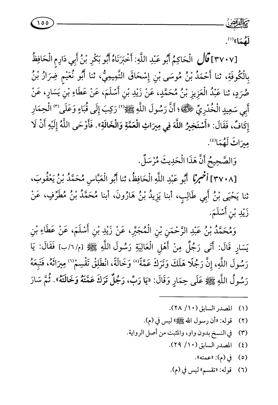 [3707] قال الْحَاكِمُ أَبُو عَبْدِ اللَّهِ: أَخْبَرَنَاهُ أَبُو بَكْرِ بْنُ أَبِي دَارِمٍ الْحَافِظُ بِالْكُوفَةِ، ثنا أَحْمَدُ بْنُ مُوسَى بْنِ إِسْحَاقَ التَّمِيمِيُّ، ثنا أَبُو نُعَيْمٍ ضِرَارُ بْنُ صُرَدٍ، ثنا عَبْدُ الْعَزِيزِ بْنُ مُحَمَّدٍ، عَنْ زَيْدِ بْنِ أَسْلَمَ، عَنْ عَطَاءِ بْنِ يَسَارٍ، عَنْ أَبِي سَعِيدٍ الْخُدْرِيِّ - رضي الله عنه -؛ أَنَّ رَسُولَ اللَّهِ - صلى الله عليه وسلم - (¬2) رَكِبَ إِلَى قُبَاءٍ وَعَلَى (¬3) الْحِمَارِ إِكَافٌ، فَقَالَ: "أَسْتَخِيرُ اللَّهَ فِي مِيرَاثِ الْعَمَّةِ وَالْخَالَةِ". فَأَوْحَى اللَّهُ إِلَيْهِ أَنْ لَا مِيرَاثَ لَهُمَا (¬4).