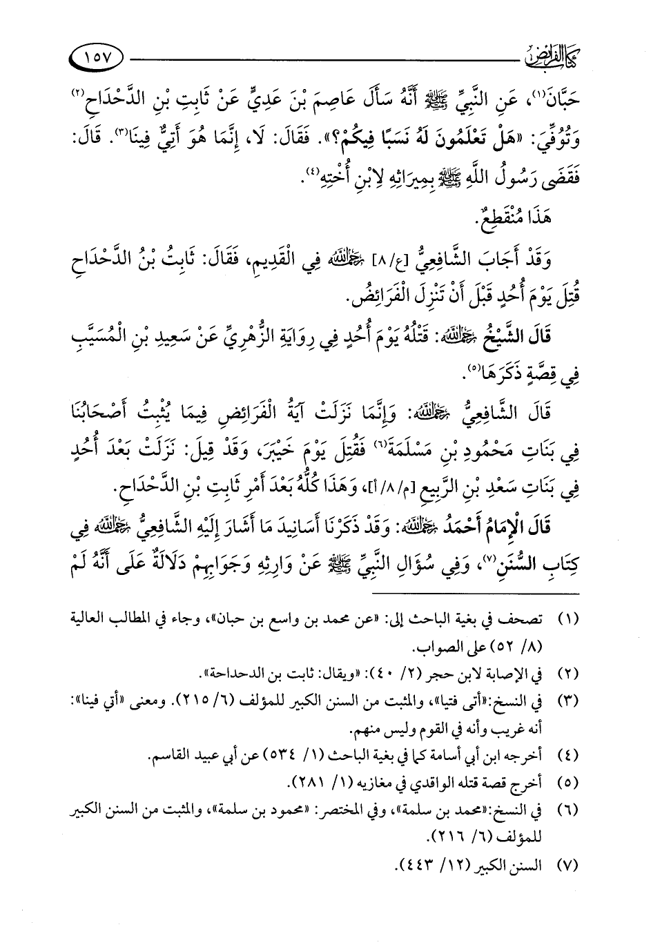 وَقَدْ أَجَابَ الشَّافِعِيُّ - رحمه الله - فِي الْقَدِيمِ، فَقَالَ: ثَابِتُ بْنُ الدَّحْدَاحِ قُتِلَ يَوْمَ أُحُدٍ قَبْلَ أَنْ تَنْزِلَ الْفَرَائِضُ.