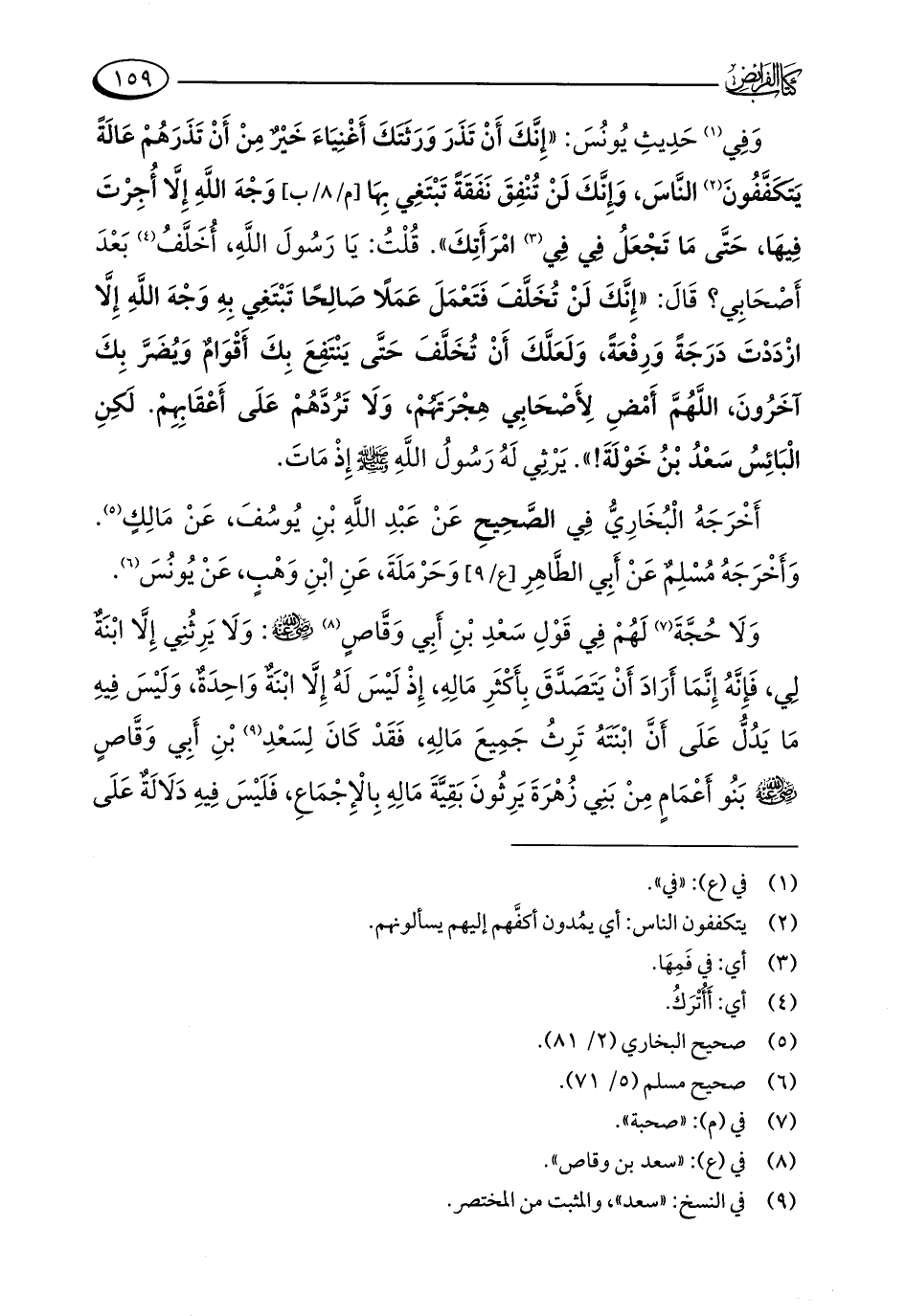 وَلَا حُجَّةَ (¬7) لَهُمْ فِي قَوْلِ سَعْدِ بْنِ أَبِي وَقَّاصٍ (¬8) - رضي الله عنه -: وَلَا يَرِثُنِي إِلَّا ابْنَةٌ لِي، فَإِنَّهُ إِنَّمَا أَرَادَ أَنْ يَتَصَدَّقَ بِأَكْثَرِ مَالِهِ، إِذْ لَيْسَ لَهُ إِلَّا ابْنَةٌ وَاحِدَةٌ، وَلَيْسَ فِيهِ مَا يَدُلُّ عَلَى أَنَّ ابْنَتَهُ تَرِثُ جَمِيعَ مَالِهِ، فَقَدْ كَانَ لِسَعْدِ (¬9) بْنِ أَبِي وَقَّاصٍ - رضي الله عنه - بَنُو أَعْمَامٍ مِنْ بَنِي زُهْرَةَ يَرِثُونَ بَقِيَّةَ مَالِهِ بِالْإِجْمَاعِ، فَلَيْسَ فِيهِ دَلَالَةٌ عَلَى