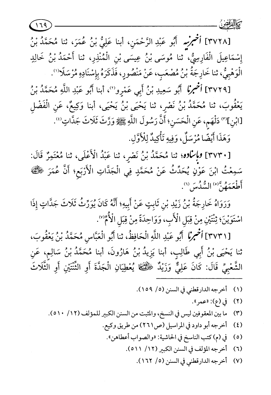 [3729] أخبرنا أَبُو سَعِيدِ بْنُ أَبِي عَمْرٍو (¬2)، أبنا أَبُو عَبْدِ اللَّهِ مُحَمَّدُ بْنُ يَعْقُوبَ، ثنا مُحَمَّدُ بْنُ نَصْرٍ، ثنا يَحْيَى بْنُ يَحْيَى، أبنا وَكِيعٌ، عَنِ الْفَضْلِ [ابْنِ] (¬3) دَلْهَمٍ، عَنِ الْحَسَنِ؛ أَنَّ رَسُولَ اللَّهِ - صلى الله عليه وسلم - وَرَّثَ ثَلَاثَ جَدَّاتٍ (¬4).
