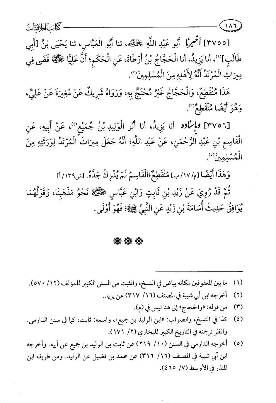 [3755] أخبرنا أَبُو عَبْدِ اللَّهِ - رحمه الله -، ثنا أَبُو الْعَبَّاسِ، ثنا يَحْيَى بْنُ [أَبِي طَالَبٍ] (¬1)، أنا يَزِيدُ، أنا الْحَجَّاجُ بْنُ أَرْطَاةَ، عَنِ الْحَكَمِ؛ أَنَّ عَلِيًّا - رضي الله عنه - قَضَى فِي مِيرَاثِ الْمُرْتَدِّ أَنَّهُ لِأَهْلِهِ مِنَ الْمُسْلِمِينَ (¬2).