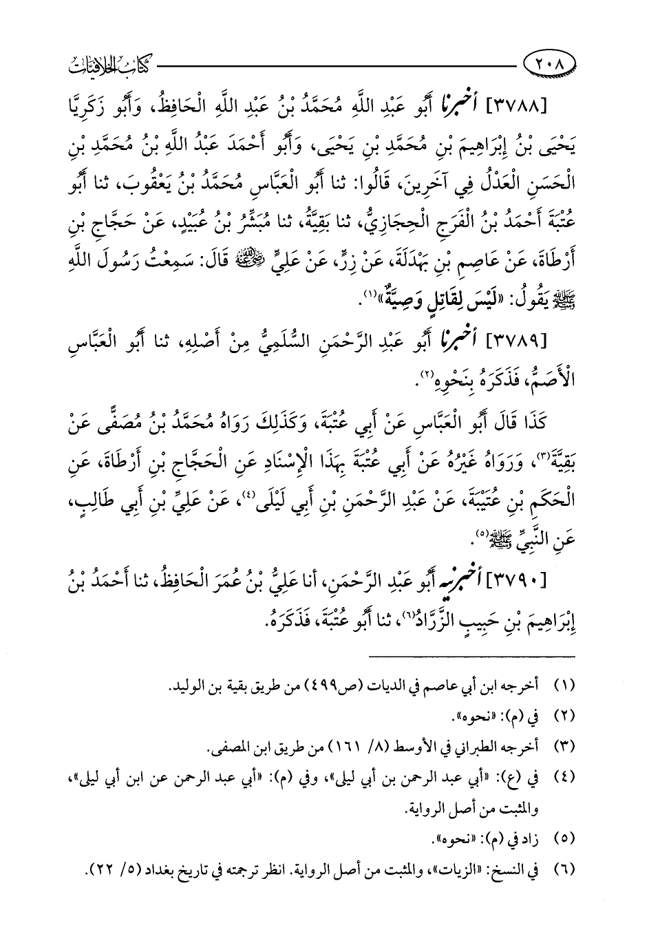 [3788] أخبرنا أَبُو عَبْدِ اللَّهِ مُحَمَّدُ بْنُ عَبْدِ اللَّهِ الْحَافِظُ، وَأَبُو زَكَرِيَّا يَحْيَى بْنُ إِبْرَاهِيمَ بْنِ مُحَمَّدِ بْنِ يَحْيَى، وَأَبُو أَحْمَدَ عَبْدُ اللَّهِ بْنُ مُحَمَّدِ بْنِ الْحَسَنِ الْعَدْلُ فِي آخَرِينَ، قَالُوا: ثنا أَبُو الْعَبَّاسِ مُحَمَّدُ بْنُ يَعْقُوبَ، ثنا أَبُو عُتْبَةَ أَحْمَدُ بْنُ الْفَرَجِ الْحِجَازِيُّ، ثنا بَقِيَّةُ، ثنا مُبَشِّرُ بْنُ عُبَيْدٍ، عَنْ حَجَّاجِ بْنِ أَرْطَاةَ، عَنْ عَاصِمِ بْنِ بَهْدَلَةَ، عَنْ زِرٍّ، عَنْ عَلِيٍّ - رضي الله عنه - قَالَ: سَمِعْتُ رَسُولَ اللَّهِ - صلى الله عليه وسلم - يَقُولُ: "لَيْسَ لِقَاتِلٍ وَصِيَّةٌ" (¬1).