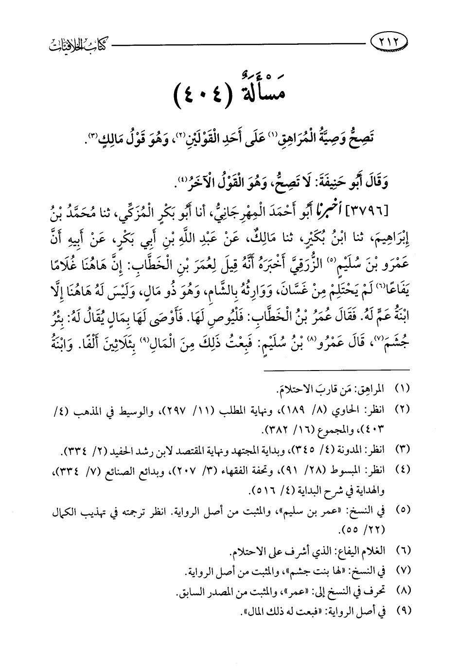 (¬3) انظر: المدونة (4/ 345)، وبداية المجتهد ونهاية المقتصد لابن رشد الحفيد (2/ 334).