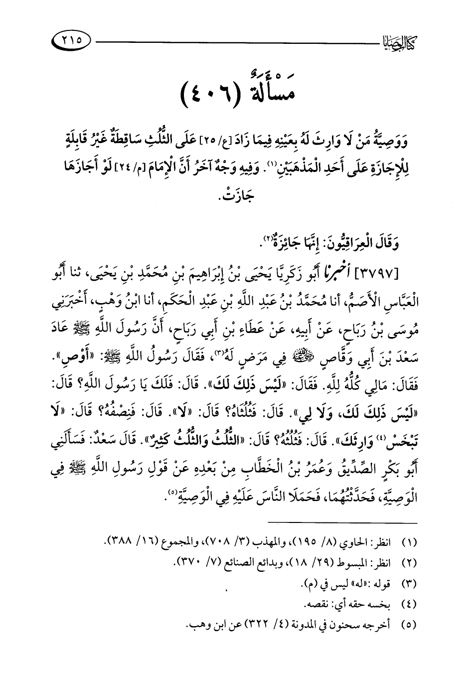 مَسْأَلَةٌ (406): وَوَصِيَّةُ مَنْ لَا وَارِثَ لَهُ بِعَيْنِهِ فِيمَا زَادَ عَلَى الثُّلثِ سَاقِطَةٌ غَيْرُ قَابِلَةٍ لِلْإِجَازَةِ عَلَى أَحَدِ الْمَذْهَبَيْنِ (¬1). وَفِيهِ وَجْهٌ آخَرُ أَنَّ الْإِمَامَ لَوْ أَجَازَهَا جَازَتْ.