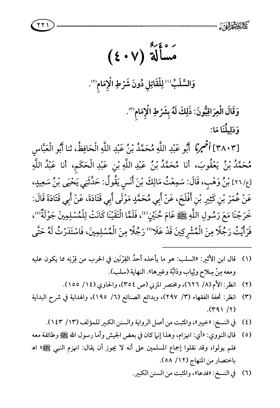 (¬1) قال ابن الأثير: "السلب: هو ما يأخذه أحدُ القِرْنَين في الحرب من قِرْنِه مما يكون عليه ومعه مِنْ سِلاح وثِياب ودَابَّة وغيرها". النهاية (سلب).