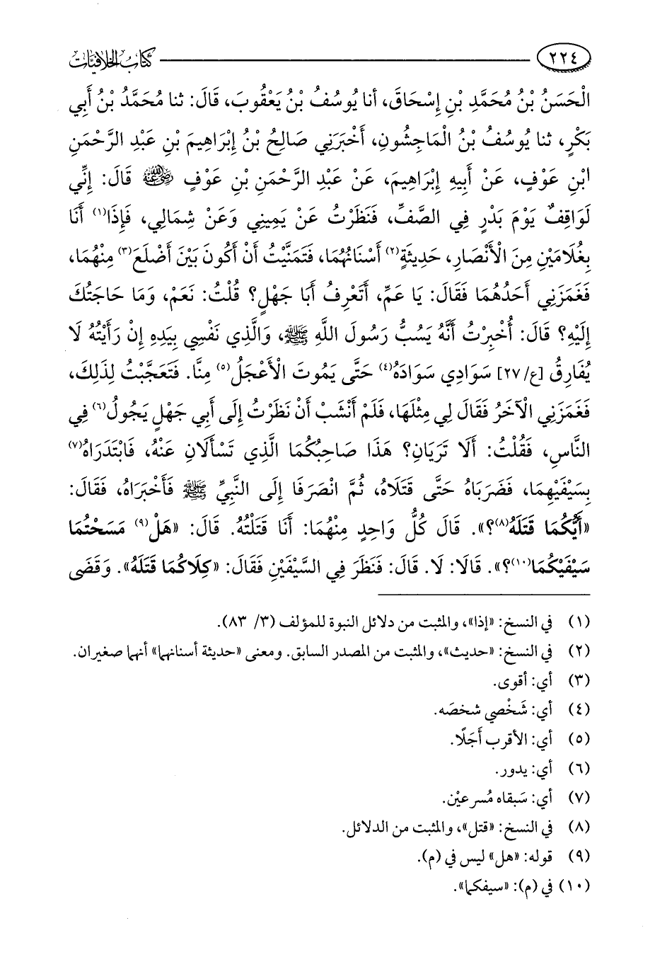 الْحَسَنُ بْنُ مُحَمَّدِ بْنِ إِسْحَاقَ، أنا يُوسُفُ بْنُ يَعْقُوبَ، قَالَ: ثنا مُحَمَّدُ بْنُ أَبِي بَكْرٍ، ثنا يُوسُفُ بْنُ الْمَاجِشُونِ، أَخْبَرَنِي صَالِحُ بْنُ إِبْرَاهِيمَ بْنِ عَبْدِ الرَّحْمَنِ بْنِ عَوْفٍ، عَنْ أَبِيهِ إِبْرَاهِيمَ، عَنْ عَبْدِ الرَّحْمَنِ بْنِ عَوْفٍ - رضي الله عنه - قالَ: إِنِّي لَوَاقِفٌ يَوْمَ بَدْرٍ فِي الصَّفِّ، فَنَظَرْتُ عَنْ يَمِينِي وَعَنْ شِمَالِي، فَإِذَا (¬1) أَنَا بِغُلَامَيْنِ مِنَ الْأَنْصَارِ، حَدِيثَةٍ (¬2) أَسْنَانُهُمَا، فَتَمَنَّيْتُ أَنْ أَكُونَ بَيْنَ أَضْلَعَ (¬3) مِنْهُمَا، فَغَمَزَنِي أَحَدُهُمَا فَقَالَ: يَا عَمِّ، أَتَعْرِفُ أَبَا جَهْلٍ؟ قُلْتُ: نَعَمْ، وَمَا حَاجَتُكَ إِلَيْهِ؟ قَالَ: أُخْبِرْتُ أنَّه يَسُبُّ رَسُولَ اللَّهِ - صلى الله عليه وسلم -، وَالَّذِي نَفْسِي بِيَدِهِ إِنْ رَأَيْتُهُ لَا يُفَارِقُ سَوَادِي سَوَادَهُ (¬4) حَتَّى يَمُوتَ الْأَعْجَلُ (¬5) مِنَّا. فَتَعَجَّبْتُ لِذَلِكَ، فَغَمَزَنِي الْآخَرُ فَقَالَ لِي مِثْلَهَا، فَلَمْ أَنْشَبْ أَنْ نَظَرْتُ إِلَى أَبِي جَهْلٍ يَجُولُ (¬6) فِي النَّاسِ، فَقُلْتُ: أَلَا تَرَيَانِ؟ هَذَا صَاحِبُكُمَا الَّذِي تَسْأَلَانِ عَنْهُ، فَابْتَدَرَاهُ (¬7) بِسَيْفَيْهِمَا، فَضَرَبَاهُ حَتَّى قَتَلَاهُ، ثُمَّ انْصَرَفَا إِلَى النَّبِيِّ - صلى الله عليه وسلم - فأَخْبَرَاهُ، فَقَالَ: "أَيُّكُمَا قَتَلَهُ (¬8)؟ ". قَالَ كُلُّ وَاحِدٍ مِنْهُمَا: أَنَا قَتَلْتُهُ. قَالَ: "هَلْ (¬9) مَسَحْتُمَا سَيْفَيْكُمَا (¬10)؟ . قَالَا: لَا. قَالَ: فَنَظَرَ فِي السَّيْفَيْنِ فَقَالَ: "كِلَاكُمَا قَتَلَهُ". وَقَضَى