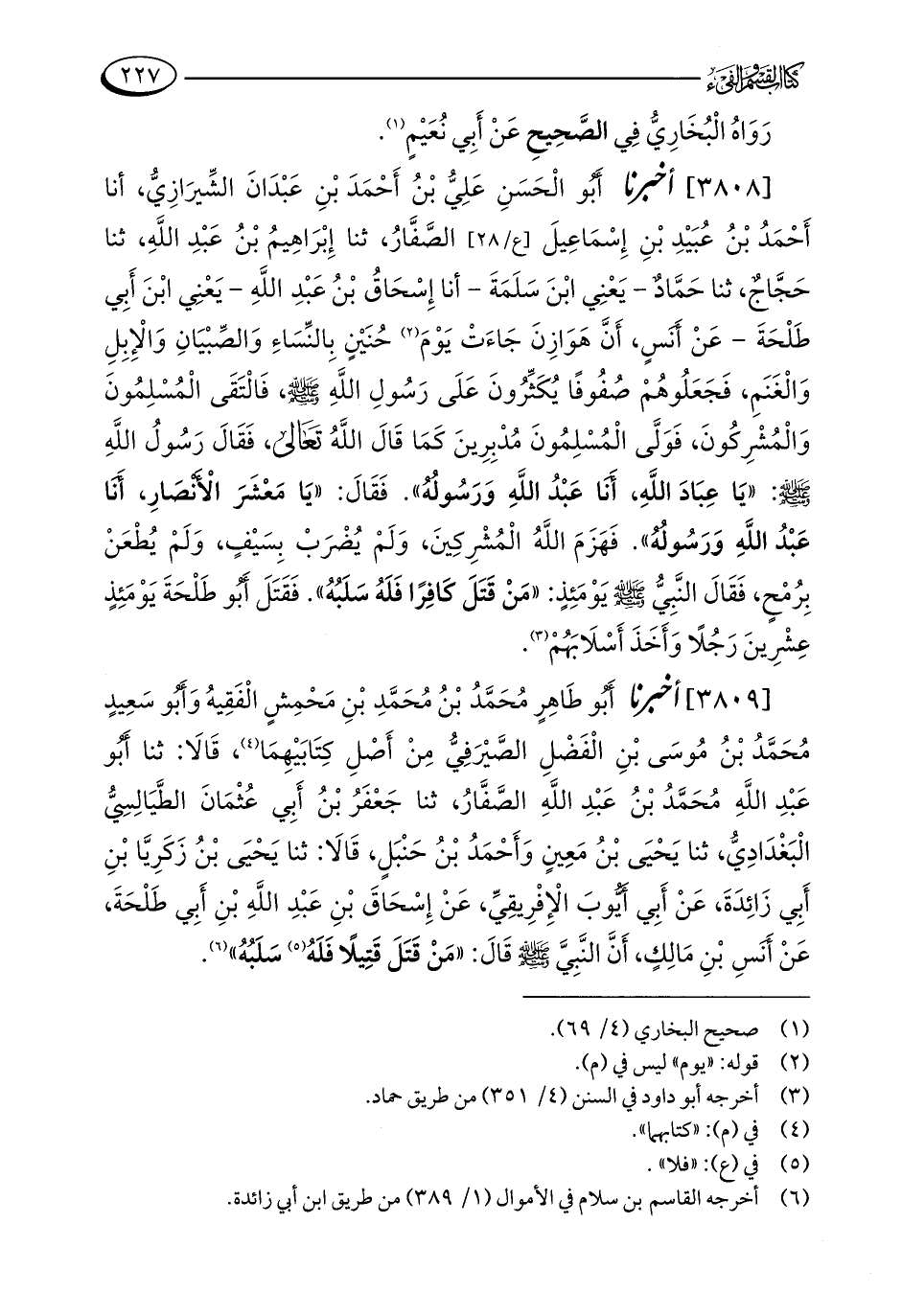 [3809] أخبرنا أَبُو طَاهِرٍ مُحَمَّدُ بْنُ مُحَمَّدِ بْنِ مَحْمِشٍ الْفَقِيهُ وَأَبُو سَعِيدٍ مُحَمَّدُ بْنُ مُوسَى بْنِ الْفَضْلِ الصَّيْرَفِيُّ مِنْ أَصْلِ كِتَابَيْهِمَا (¬4)، قَالَا: ثنا أَبُو عَبْدِ اللَّهِ مُحَمَّدُ بْنُ عَبْدِ اللَّهِ الصَّفَّارُ، ثنا جَعْفَرُ بْنُ أَبِي عُثْمَانَ الطَّيَالِسِيُّ الْبَغْدَادِيُّ، ثنا يَحْيَى بْنُ مَعِينٍ وَأَحْمَدُ بْنُ حَنْبَلٍ، قَالَا: ثنا يَحْيَى بْنُ زَكَرِيَّا بْنِ أَبِي زَائِدَةَ، عَنْ أَبِي أَيُّوبَ الْإِفْرِيقِيِّ، عَنْ إِسْحَاقَ بْنِ عَبْدِ اللَّهِ بْنِ أَبِي طَلْحَةَ، عَنْ أَنَسِ بْنِ مَالِكٍ، أَنَّ النَّبِيَّ - صلى الله عليه وسلم - قَالَ: "مَنْ قَتَلَ قَتِيلًا فَلَهُ (¬5) سَلَبُهُ" (¬6).