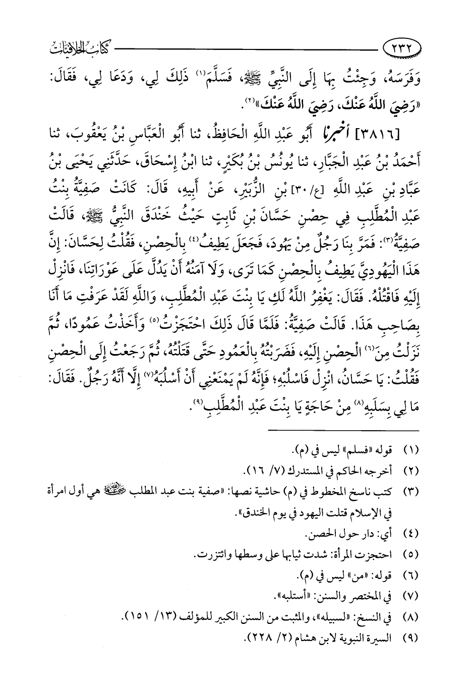 [3816] أخبرنا أَبُو عَبْدِ اللَّهِ الْحَافِظُ، ثنا أَبُو الْعَبَّاسِ بْنُ يَعْقُوبَ، ثنا أَحْمَدُ بْنُ عَبْدِ الْجَبَّارِ، ثنا يُونُسُ بْنُ بُكَيْرٍ، ثنا ابْنُ إِسْحَاقَ، حَدَّثَنِي يَحْيَى بْنُ عَبَّادِ بْنِ عَبْدِ اللَّهِ بْنِ الزُّبَيْرِ، عَنْ أَبِيهِ، قَالَ: كَانَتْ صَفِيَّةُ بِنْتُ عَبْدِ الْمُطَّلِبِ فِي حِصْنِ حَسَّانَ بْنِ ثَابِتٍ حَيْثُ خَنْدَقَ النَّبِيُّ - صلى الله عليه وسلم -، قَالَتْ صَفِيَّةُ (¬3): فَمَرَّ بِنَا رَجُلٌ مِنْ يَهُودَ، فَجَعَلَ يَطِيفُ (¬4) بِالْحِصْنِ، فَقُلْتُ لِحَسَّانَ: إِنَّ هَذَا الْيَهُودِيَّ يَطِيفُ بِالْحِصْنِ كَمَا تَرَى، وَلَا آمَنُهُ أَنْ يَدُلَّ عَلَى عَوْرَاتِنَا، فَانْزِلْ إِلَيْهِ فَاقْتُلْهُ. فَقَالَ: يَغْفِرُ اللَّهُ لَكِ يَا بِنْتَ عَبْدِ الْمُطَّلِبِ، وَاللَّهِ لَقَدْ عَرَفْتِ مَا أَنَا بِصَاحِبِ هَذَا. قَالَتْ صَفِيَّةُ: فَلَمَّا قَالَ ذَلِكَ احْتَجَزْتُ (¬5) وَأَخَذْتُ عَمُودًا، ثُمَّ نَزَلْتُ مِنَ (¬6) الْحِصْنِ إِلَيْهِ، فَضَرَبْتُهُ بِالْعَمُودِ حَتَّى قَتَلْتُهُ، ثُمَّ رَجَعْتُ إِلَى الْحِصْنِ فَقُلْتُ: يَا حَسَّانُ، انْزِلْ فَاسْلُبْهِ؛ فَإِنَّهُ لَم يَمْنَعْنِي أَنْ أَسْلُبَهُ (¬7) إِلَّا أَنَّهُ رَجُلٌ. فَقَالَ: مَا لِي بِسَلَبِهِ (¬8) مِنْ حَاجَةٍ يَا بِنْتَ عَبْدِ الْمُطَّلِبِ (¬9).