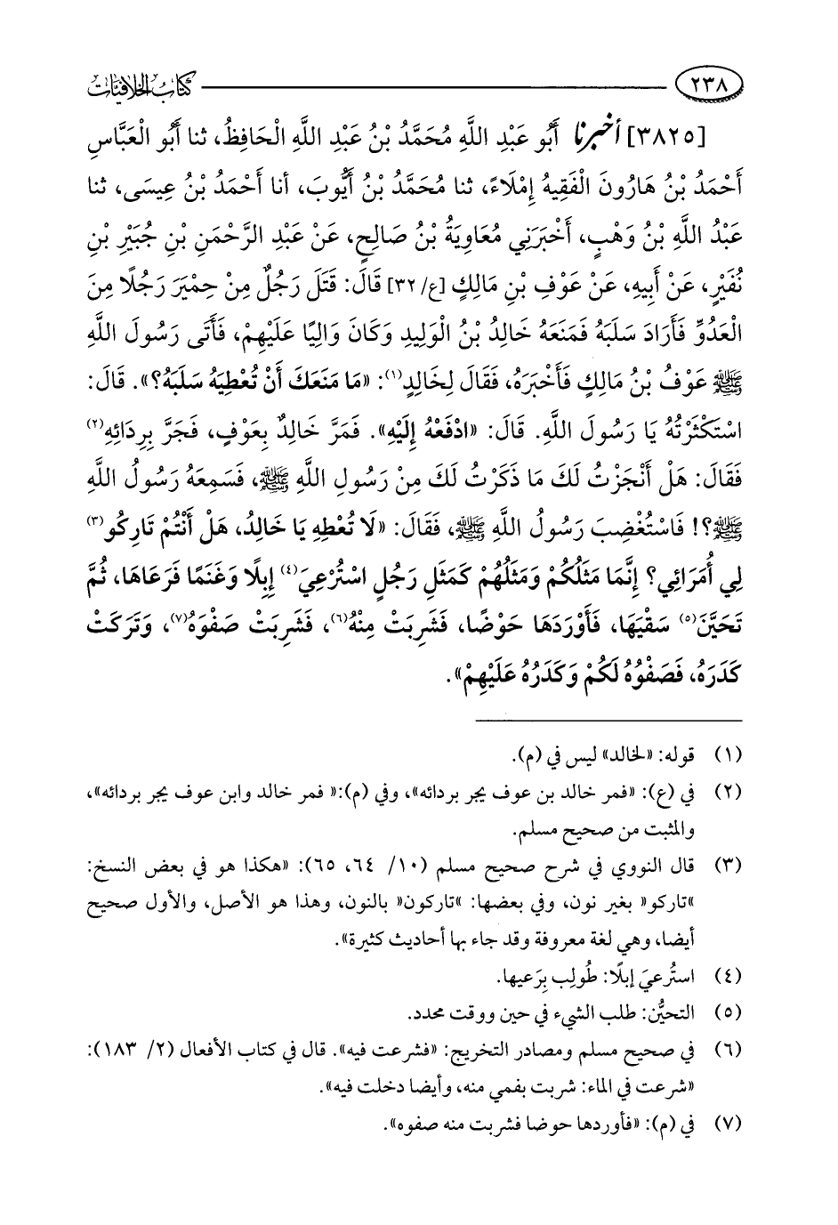 [3825] أخبرنا أَبُو عَبْدِ اللَّهِ مُحَمَّدُ بْنُ عَبْدِ اللَّهِ الْحَافِظُ، ثنا أَبُو الْعَبَّاسِ أَحْمَدُ بْنُ هَارُونَ الْفَقِيهُ إِمْلَاءً، ثنا مُحَمَّدُ بْنُ أَيُّوبَ، أنا أَحْمَدُ بْنُ عِيسَى، ثنا عَبْدُ اللَّهِ بْنُ وَهْبٍ، أَخْبَرَنِي مُعَاوِيَةُ بْنُ صَالِحٍ، عَنْ عَبْدِ الرَّحْمَنِ بْنِ جُبَيْرِ بْنِ نُفَيْرٍ، عَنْ أَبِيهِ، عَنْ عَوْفِ بْنِ مَالِكٍ قَالَ: قَتَلَ رَجُلٌ مِنْ حِمْيَرَ رَجُلًا مِنَ الْعَدُوِّ فَأَرَادَ سَلَبَهُ فَمَنَعَهُ خَالِدُ بْنُ الْوَلِيدِ وَكَانَ وَالِيًا عَلَيْهِمْ، فَأَتَى رَسُولَ اللَّهِ - صلى الله عليه وسلم - عَوْفُ بْنُ مَالِكٍ فَأَخْبَرَهُ، فَقَالَ لِخَالِدٍ (¬1): "مَا مَنَعَكَ أَنْ تُعْطِيَهُ سَلَبَهُ؟ ". قَالَ: اسْتَكْثَرْتُهُ يَا رَسُولَ اللَّهِ. قَالَ: "ادْفَعْهُ إِلَيْهِ". فَمَرَّ خَالِدٌ بِعَوْفٍ، فَجَرَّ بِرِدَائِهِ (¬2) فَقَالَ: هَلْ أَنْجَزْتُ لَكَ مَا ذَكَرْتُ لَكَ مِنْ رَسُولِ اللَّهِ - صلى الله عليه وسلم -، فَسَمِعَهُ رَسُولُ اللَّهِ - صلى الله عليه وسلم -؟ ! فَاسْتُغْضِبَ رَسُولُ اللَّهِ - صلى الله عليه وسلم -، فَقَالَ: "لَا تُعْطِهِ يَا خَالِدُ، هَلْ أَنْتُمْ تَارِكُو (¬3) لِي أُمَرَائِي؟ إِنَّمَا مَثَلُكُمْ وَمَثَلُهُمْ كَمَثَلِ رَجُلٍ اسْتُرْعِيَ (¬4) إِبِلًا وَغَنَمًا فَرَعَاهَا، ثُمَّ تَحَيَّنَ (¬5) سَقْيَهَا، فَأَوْرَدَهَا حَوْضًا، فَشَرِبَتْ مِنْهُ (¬6)، فَشَرِبَتْ صَفْوَهُ (¬7)، وَتَرَكَتْ كَدَرَهُ، فَصَفْوُهُ لَكُمْ وَكَدَرُهُ عَلَيْهِمْ".