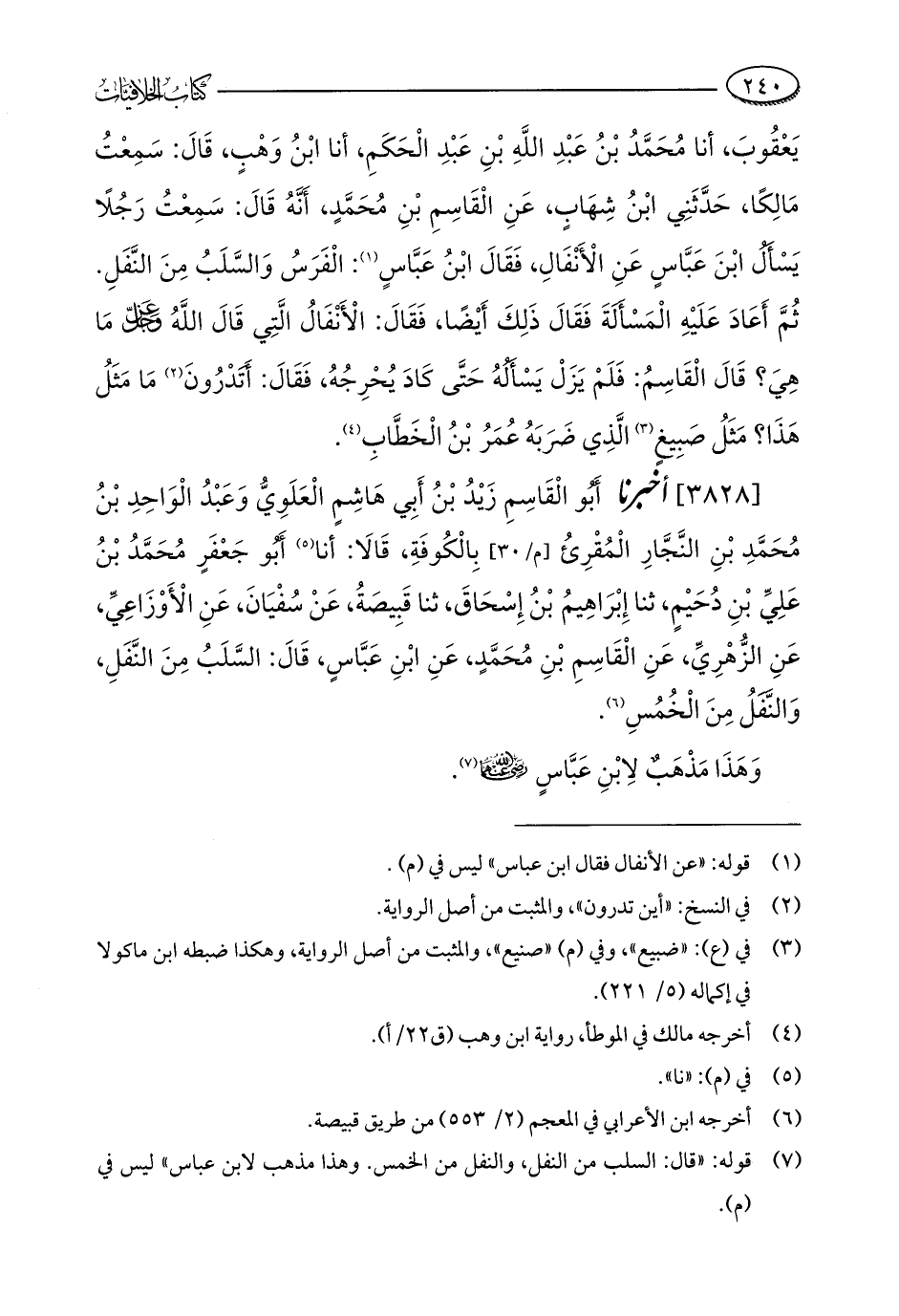 [3828] أخبرنا أَبُو الْقَاسِمِ زَيْدُ بْنُ أَبِي هَاشِمٍ الْعَلَوِيُّ وَعَبْدُ الْوَاحِدِ بْنُ مُحَمَّدِ بْنِ النَّجَّارِ الْمُقْرِئُ بِالْكُوفَةِ، قَالَا: أنا (¬5) أَبُو جَعْفَرٍ مُحَمَّدُ بْنُ عَلِيِّ بْنِ دُحَيْمٍ، ثنا إِبْرَاهِيمُ بْنُ إِسْحَاقَ، ثنا قَبِيصَةُ، عَنْ سُفْيَانَ، عَنِ الْأَوْزَاعِيِّ، عَنِ الزُّهْرِيِّ، عَنِ الْقَاسِمِ بْنِ مُحَمَّدٍ، عَنِ ابْنِ عَبَّاسٍ، قَالَ: السَّلَبُ مِنَ النَّفَلِ، وَالنَّفَلُ مِنَ الْخُمُسِ (¬6).