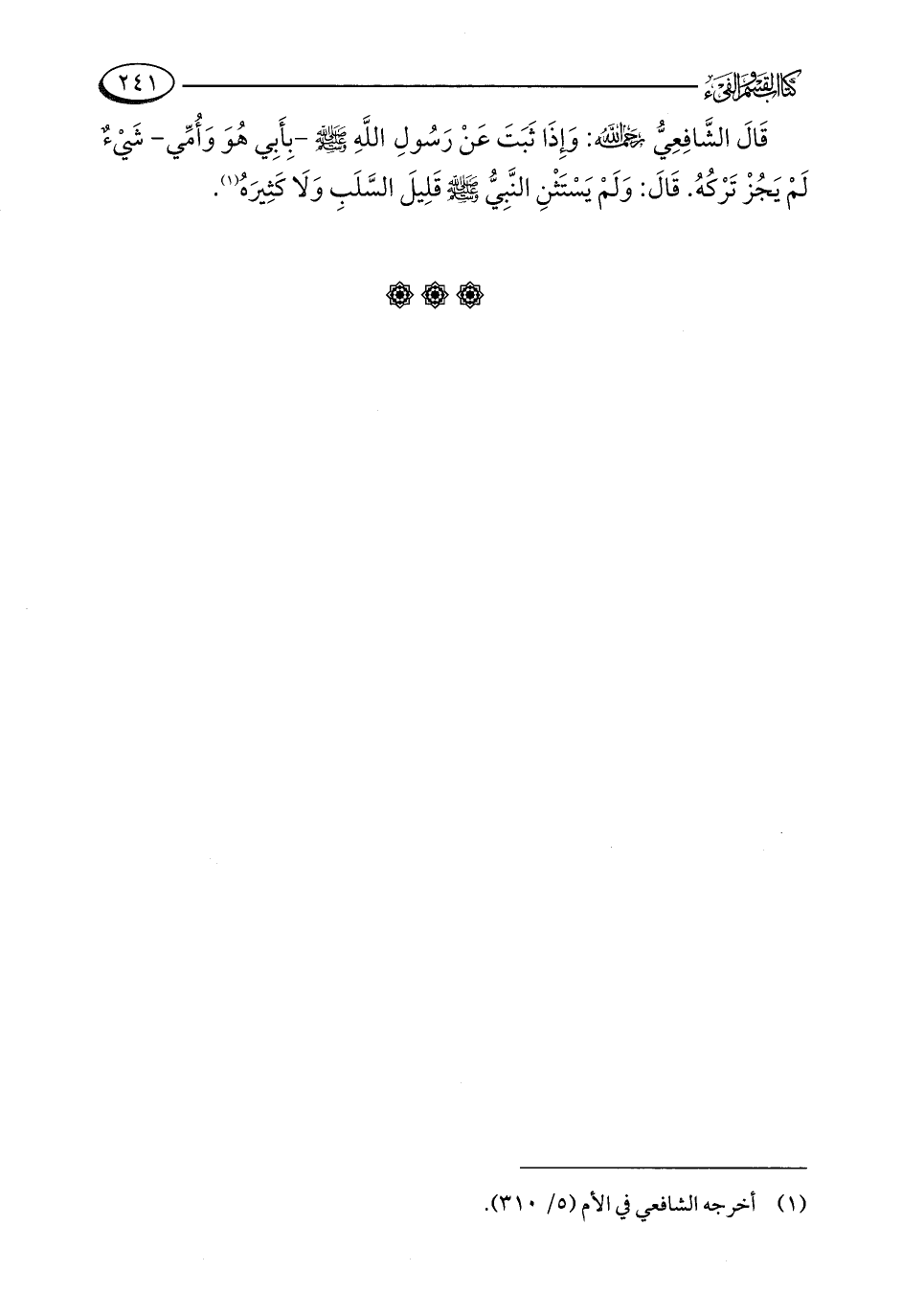 قَالَ الشَّافِعِيُّ - رحمه الله -: وإِذَا ثَبَتَ عَنْ رَسُولِ اللَّهِ - صلى الله عليه وسلم - بِأَبِي هُوَ وَأُمِّي - شَيْءٌ لَمْ يَجُزْ تَرْكُهُ. قَالَ: وَلَمْ يَسْتَثْنِ النَّبِيُّ - صلى الله عليه وسلم - قَلِيلَ السَّلَبِ وَلَا كَثِيرَهُ (¬1).