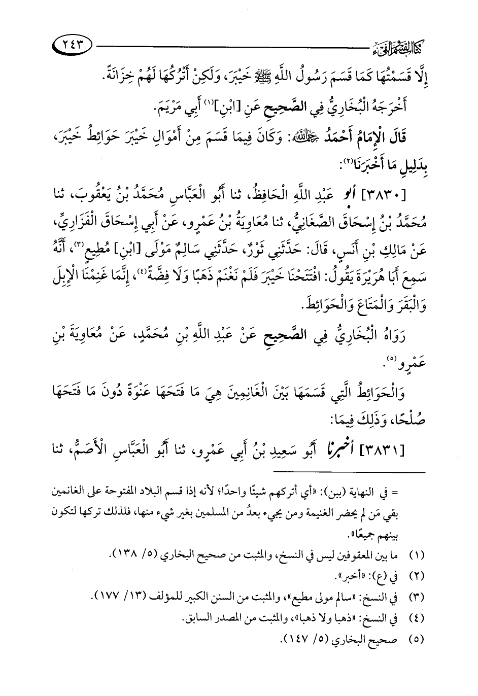 [3830] أبو عَبْدِ اللَّهِ الْحَافِظُ، ثنا أَبُو الْعَبَّاسِ مُحَمَّدُ بْنُ يَعْقُوبَ، ثنا مُحَمَّدُ بْنُ إِسْحَاقَ الصَّغَانِيُّ، ثنا مُعَاوِيَةُ بْنُ عَمْرٍو، عَنْ أَبِي إِسْحَاقَ الْفَزَارِيِّ، عَنْ مَالِكِ بْنِ أَنَسٍ، قَالَ: حَدَّثَنِي ثَوْرٌ، حَدَّثَنِي سالِمٌ مَوْلَى [ابْنِ] مُطِيعٍ (¬3)، أَنَّهُ سَمِعَ أَبَا هُرَيْرَةَ يَقُولُ: افْتَتَحْنَا خَيْبَرَ فَلَمْ نَغْنَمْ ذَهَبًا وَلَا فِضَّةً (¬4)، إِنَّمَا غَنِمْنَا الْإِبِلَ وَالْبَقَرَ وَالْمَتَاعَ وَالْحَوَائِطَ.