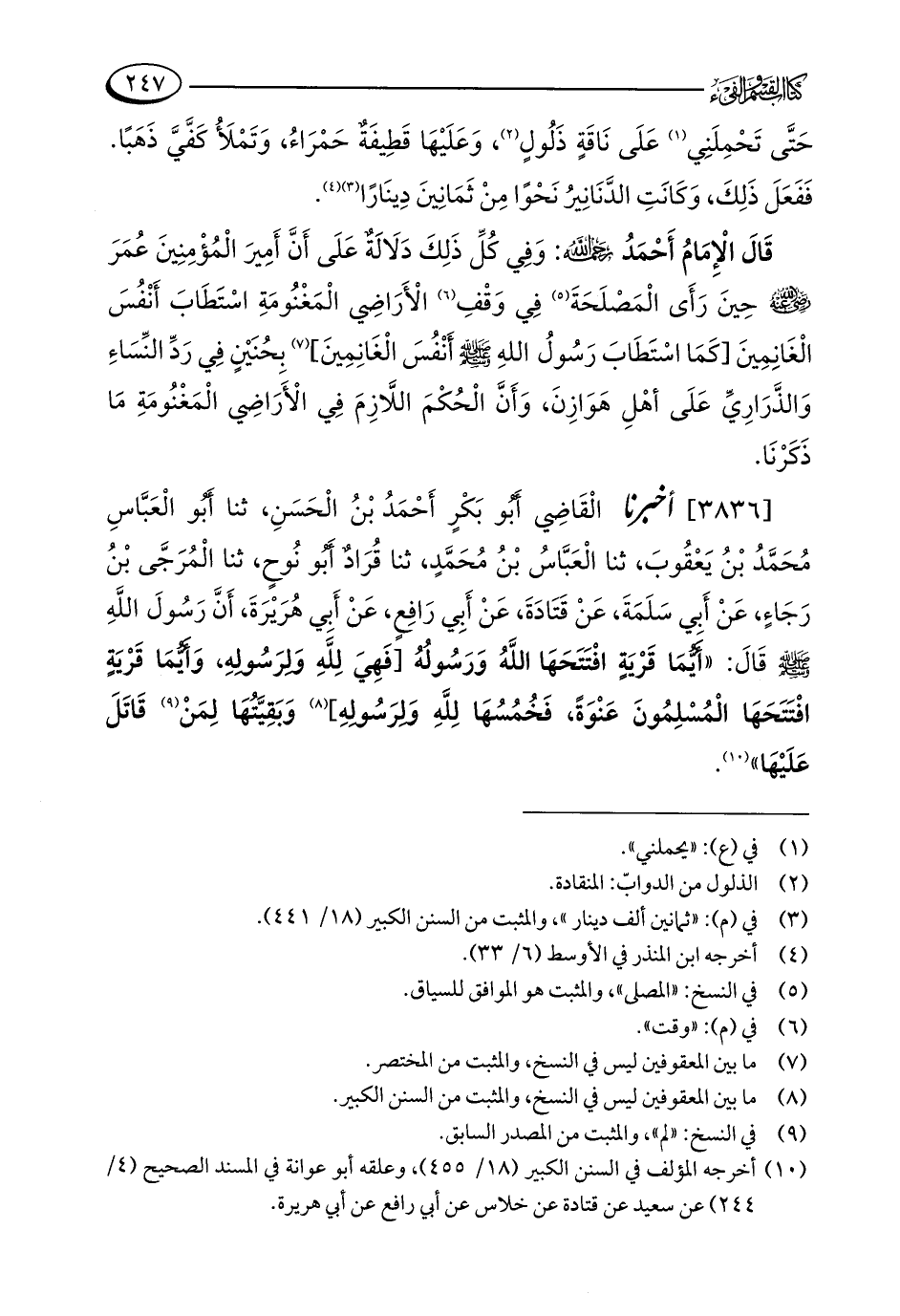 قَالَ الْإِمَامُ أَحْمَدُ - رحمه الله -: وَفِي كُلِّ ذَلِكَ دَلَالَةٌ عَلَى أَنَّ أَمِيرَ الْمُؤْمِنِينَ عُمَرَ - رضي الله عنه - حِينَ رَأَى الْمَصْلَحَة (¬5) فِي وَقْفِ (¬6) الْأَرَاضِي الْمَغْنُومَةِ اسْتَطَابَ أَنْفُسَ الْغَانِمِينَ [كَمَا اسْتَطَابَ رَسُولُ اللَّهِ - صلى الله عليه وسلم - أَنْفُسَ الْغَانِمِينَ] (¬7) بِحُنَيْنٍ فِي رَدِّ النِّسَاءِ وَالذَّرَارِيِّ عَلَى أهْلِ هَوَازِنَ، وَأَنَّ الْحُكْمَ اللَّازِمَ فِي الْأَرَاضِي الْمَغْنُومَةِ مَا ذَكَرْنَا.
