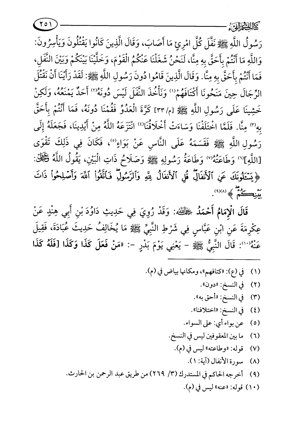 رَسُولُ اللَّهِ - صلى الله عليه وسلم - نَفَّلَ كُلَّ امْرِئٍ مَا أَصَابَ، وَقَالَ الَّذِينَ كَانُوا يَقْتُلُونَ وَيَأْسِرُونَ: وَاللَّهِ مَا أَنْتُمْ بِأَحَقَّ بِهِ مِنَّا، لَنَحْنُ شَغَلْنَا عَنْكُمُ الْقَوْمَ، وَخَلَّيْنَا بَيْنَكُمْ وَبَيْنَ النَّفَلِ، فَمَا أَنْتُمْ بِأَحَقَّ بِهِ مِنَّا. وَقَالَ الَّذِينَ قَامُوا دُونَ رَسُولِ اللَّهِ - صلى الله عليه وسلم -: لَقَدْ رَأَيْنَا أَنْ نَقْتُلَ الرِّجَالَ حِينَ مَنَحُونَا أَكْتَافَهُمْ (¬1) وَنَأْخُذَ النَّفَلَ لَيْسَ دُونَهُ (¬2) أَحَدٌ يَمْنَعُهُ، وَلَكِنْ خَشِينَا عَلَى رَسُولِ اللَّهِ - صلى الله عليه وسلم - كَرَّةَ الْعَدُوِّ فَقُمْنَا دُونَهُ، فَمَا أَنْتُمْ بِأَحَقَّ بِهِ (¬3) مِنَّا. فَلَمَّا اخْتَلَفْنَا وَسَاءَتْ أَخْلَاقُنَا (¬4) انْتَزَعَهُ اللَّهُ مِنْ أَيْدِينَا، فَجَعَلَهُ إِلَى رَسُولِ اللَّهِ - صلى الله عليه وسلم - فَقَسَمَهُ عَلَى النَّاسِ عَنْ بَوَاءٍ (¬5)، فَكَانَ فِي ذَلِكَ تَقْوَى [اللَّهِ] (¬6) وَطَاعَتُهُ (¬7) وَطَاعَةُ رَسُولِهِ - صلى الله عليه وسلم - وَصَلَاحُ ذَاتِ الْبَيْنِ، يَقُولُ اللَّهُ - عز وجل -: {يَسْأَلُونَكَ عَنِ الْأَنْفَالِ قُلِ الْأَنْفَالُ لِلَّهِ وَالرَّسُولِ فَاتَّقُوا اللَّهَ وَأَصْلِحُوا ذَاتَ بَيْنِكُمْ} (¬8) (¬9).