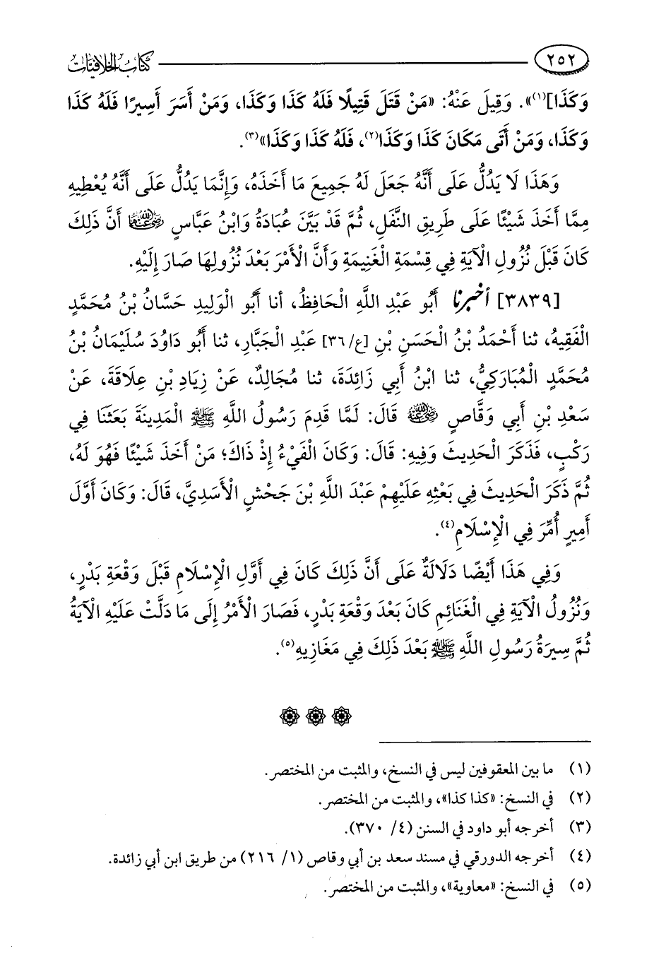[3839] أخبرنا أَبُو عَبْدِ اللَّهِ الْحَافِظُ، أنا أَبُو الْوَلِيدِ حَسَّانُ بْنُ مُحَمَّدٍ الْفَقِيهُ، ثنا أَحْمَدُ بْنُ الْحَسَنِ بْنِ عَبْدِ الْجَبَّارِ، ثنا أَبُو دَاوُدَ سُلَيْمَانُ بْنُ مُحَمَّدٍ الْمُبَارَكِيُّ، ثنا ابْنُ أَبِي زَائِدَةَ، ثنا مُجَالِدٌ، عَنْ زِيَادِ بْنِ عِلَاقَةَ، عَنْ سَعْدِ بْنِ أَبِي وَقَّاصٍ - رضي الله عنه - قَالَ: لَمَّا قَدِمَ رَسُولُ اللَّهِ - صلى الله عليه وسلم - الْمَدِينَةَ بَعَثَنَا فِي رَكْبٍ، فَذَكَرَ الْحَدِيثَ وَفِيهِ: قَالَ: وَكَانَ الْفَيْءُ إِذْ ذَاكَ؛ مَنْ أَخَذَ شَيْئًا فَهُوَ لَهُ، ثُمَّ ذَكَرَ الْحَدِيثَ فِي بَعْثِهِ عَلَيْهِمْ عَبْدَ اللَّهِ بْنَ جَحْشٍ الْأَسَدِيَّ، قَالَ: وَكَانَ أَوَّلَ أَمِيرٍ أُمِّرَ فِي الْإِسْلَامِ (¬4).