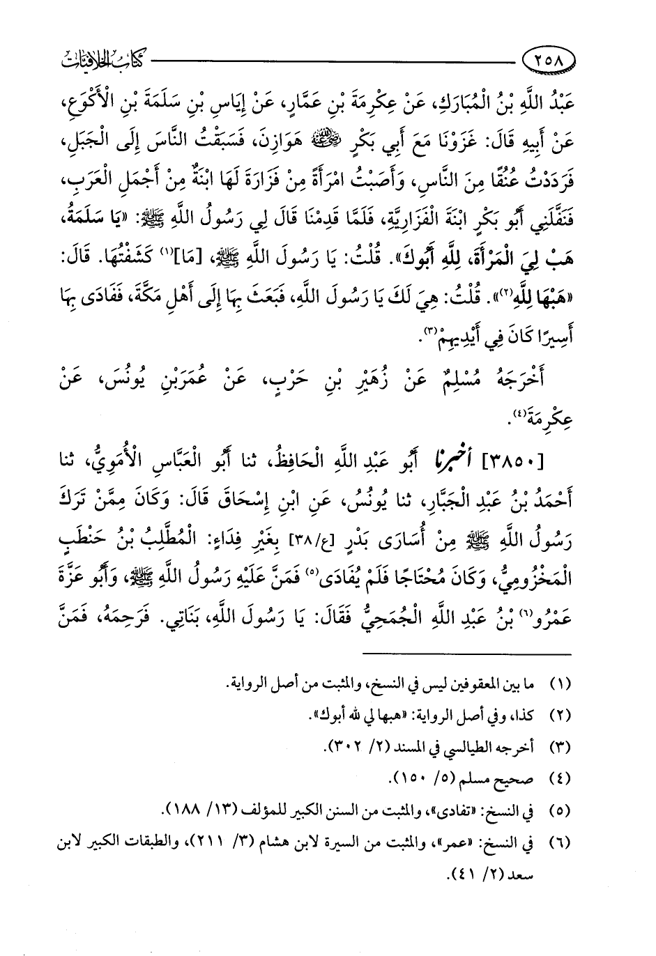 عَبْدُ اللَّهِ بْنُ الْمُبَارَكِ، عَنْ عِكْرِمَةَ بْنِ عَمَّارٍ، عَنْ إِيَاسِ بْنِ سَلَمَةَ بْنِ الْأَكْوَعِ، عَنْ أَبِيهِ قَالَ: غَزَوْنَا مَعَ أَبِي بَكْرٍ - رضي الله عنه - هَوَازِنَ، فَسَبَقْتُ النَّاسَ إِلَى الْجَبَلِ، فَرَدَدْتُ عُنُقًا مِنَ النَّاسِ، وَأَصَبْتُ امْرَأَةً مِنْ فَزَارَةَ لَهَا ابْنَةٌ مِنْ أَجْمَلِ الْعَرَبِ، فَنَفَّلَنِي أَبُو بَكْرٍ ابْنَةَ الْفَزَارِّيَّةِ، فَلَمَّا قَدِمْنَا قَالَ لِي رَسُولُ اللَّهِ - صلى الله عليه وسلم -: "يَا سَلَمَةُ، هَبْ لِيَ الْمَرْأَةَ، لِلَّهِ أَبُوكَ". قُلْتُ: يَا رَسُولَ اللَّهِ - صلى الله عليه وسلم -، [مَا] (¬1) كَشَفْتُهَا. قَالَ: "هَبْهَا لِلَّهِ (¬2) ". قُلْتُ: هِيَ لَكَ يَا رَسُولَ اللَّهِ، فَبَعَثَ بِهَا إِلَى أَهْلِ مَكَّةَ، فَفَادَى بِهَا أَسِيرًا كَانَ فِي أَيْدِيهِمْ (¬3).