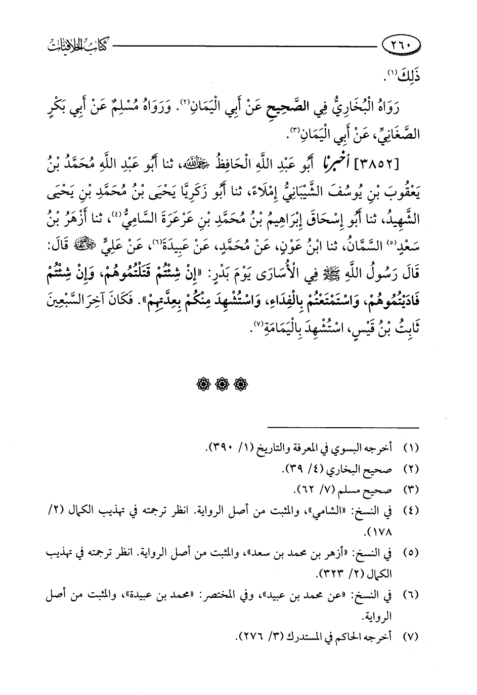 [3852] أخبرنا أبو عَبْدِ اللَّهِ الْحَافِظُ - رحمه الله -، ثنا أَبُو عَبْدِ اللَّهِ مُحَمَّدُ بْنُ يَعْقُوبَ بْنِ يُوسُفَ الشَّيْبَانِيُّ إِمْلَاءً، ثنا أَبُو زَكَرِيَّا يَحْيَى بْنُ مُحَمَّدِ بْنِ يَحْيَى الشَّهِيدُ، ثنا أبو إِسْحَاقَ إِبْرَاهِيمُ بْنُ مُحَمَّدِ بْنِ عَرْعَرَةَ السَّامِيُّ (¬4)، ثنا أَزْهَرُ بْنُ سَعْدٍ (¬5) السَّمَّانُ، ثنا ابْنُ عَوْنٍ، عَنْ مُحَمَّدٍ، عَنْ عَبِيدَةَ (¬6)، عَنْ عَلِيٍّ - رضي الله عنه - قَالَ: قَالَ رَسُولُ اللَّهِ - صلى الله عليه وسلم - فِي الْأُسَارَى يَوْمَ بَدْرٍ: "إِنْ شِئْتُمْ قَتَلْتُمُوهُمْ، وَإِنْ شِئْتُمْ فَادَيْتُمُوهُمْ، وَاسْتَمْتَعْتُمْ بِالْفِدَاءِ، وَاسْتُشْهِدَ مِنْكُمْ بِعِدَّتِهِمْ". فَكَانَ آخِرَ السَّبْعِينَ ثَابِتُ بْنُ قَيْسٍ، اسْتُشْهِدَ بِالْيَمَامَةِ (¬7).