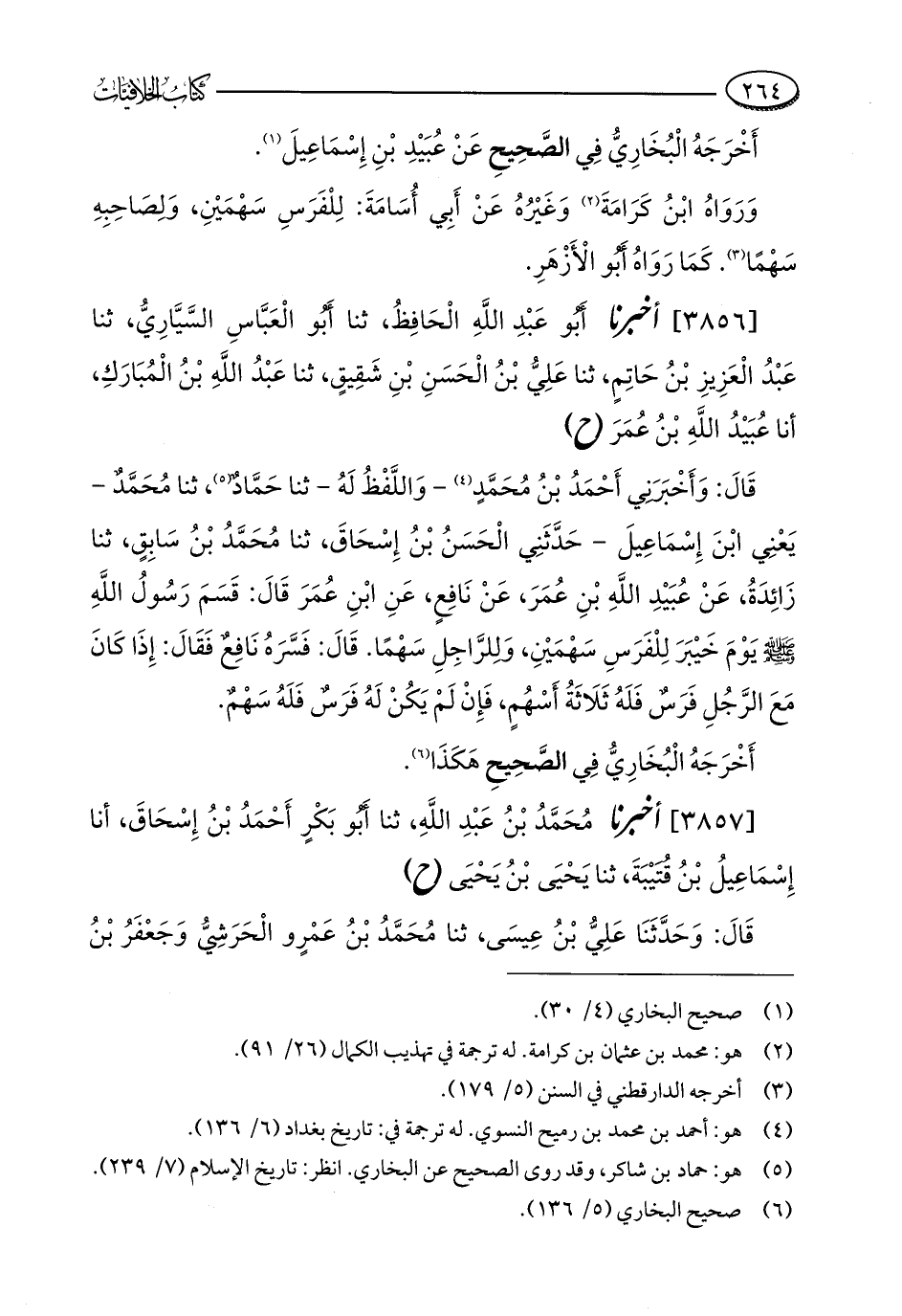 قَالَ: وَأَخْبَرَنِي أَحْمَدُ بْنُ مُحَمَّدٍ (¬4) - وَاللَّفْظُ لَهُ - ثنا حَمَّادٌ (¬5)، ثنا مُحَمَّدٌ - يَعْنِي ابْنَ إِسْمَاعِيلَ - حَدَّثَنِي الْحَسَنُ بْنُ إِسْحَاقَ، ثنا مُحَمَّدُ بْنُ سَابِقٍ، ثنا زَائِدَةُ، عَنْ عُبَيْدِ اللَّهِ بْنِ عُمَرَ، عَنْ نَافِعٍ، عَنِ ابْنِ عُمَرَ قَالَ: قَسَمَ رَسُولُ اللَّهِ - صلى الله عليه وسلم - يوْمَ خَيْبَرَ لِلْفَرَسِ سَهْمَيْنِ، وَلِلرَّاجِلِ سَهْمًا. قَالَ: فَسَّرَهُ نَافِعٌ فَقَالَ: إِذَا كَانَ مَعَ الرَّجُلِ فَرَسٌ فَلَهُ ثَلَاثَةُ أَسْهُمٍ، فَإِنْ لَمْ يَكُنْ لَهُ فَرَسٌ فَلَهُ سَهْمٌ.