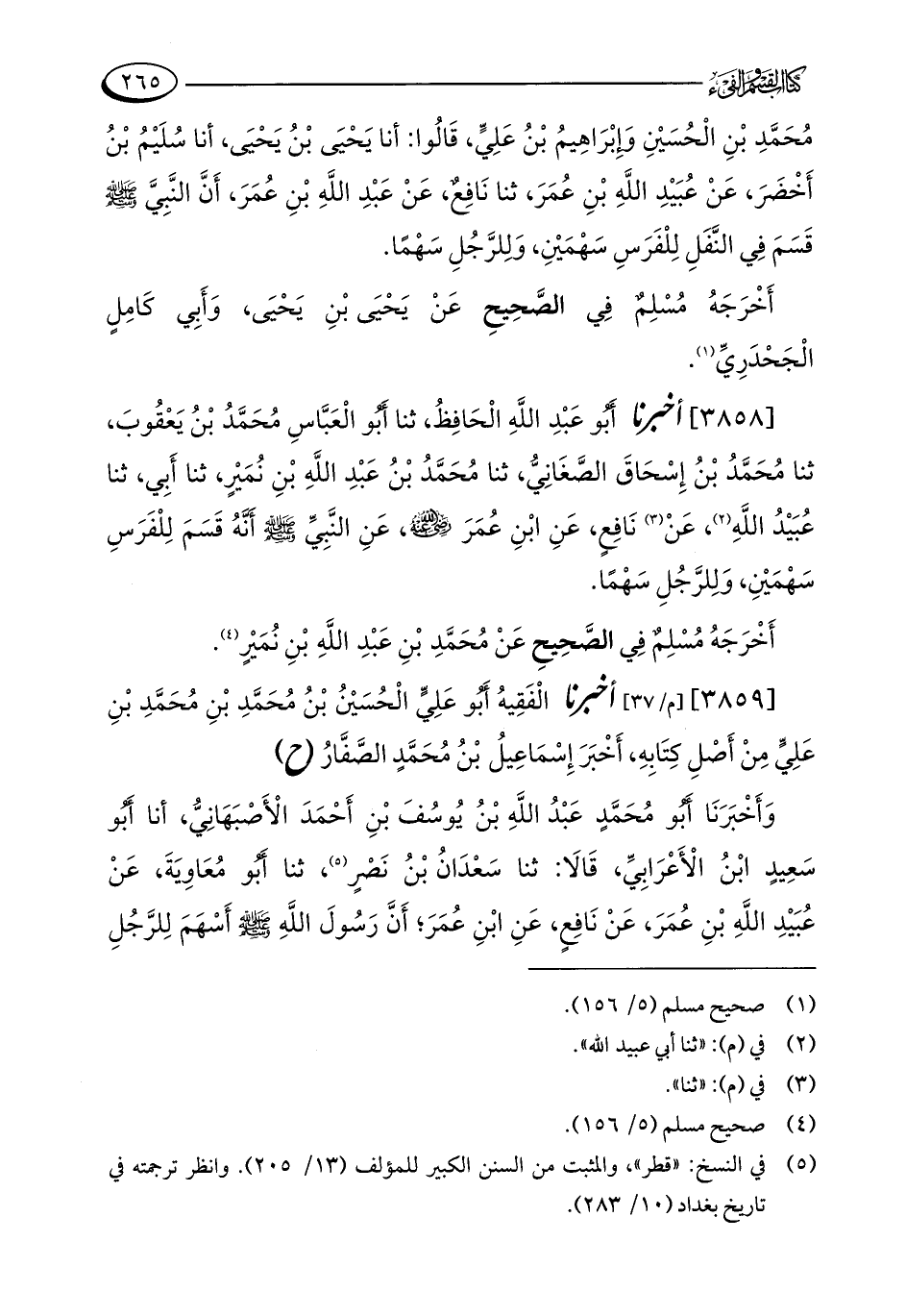 [3858] أخبرنا أَبُو عَبْدِ اللَّهِ الْحَافِظُ، ثنا أَبُو الْعَبَّاسِ مُحَمَّدُ بْنُ يَعْقُوبَ، ثنا مُحَمَّدُ بْنُ إِسْحَاقَ الصَّغَانِيُّ، ثنا مُحَمَّدُ بْنُ عَبْدِ اللَّهِ بْنِ نُمَيْرٍ، ثنا أَبِي، ثنا عُبَيْدُ اللَّهِ (¬2)، عَنْ (¬3) نَافِعٍ، عَنِ ابْنِ عُمَرَ - رضي الله عنه -، عَنِ النَّبِيِّ - صلى الله عليه وسلم - أَنَّهُ قَسَمَ لِلْفَرَسِ سَهْمَيْنِ، وَلِلرَّجُلِ سَهْمًا.