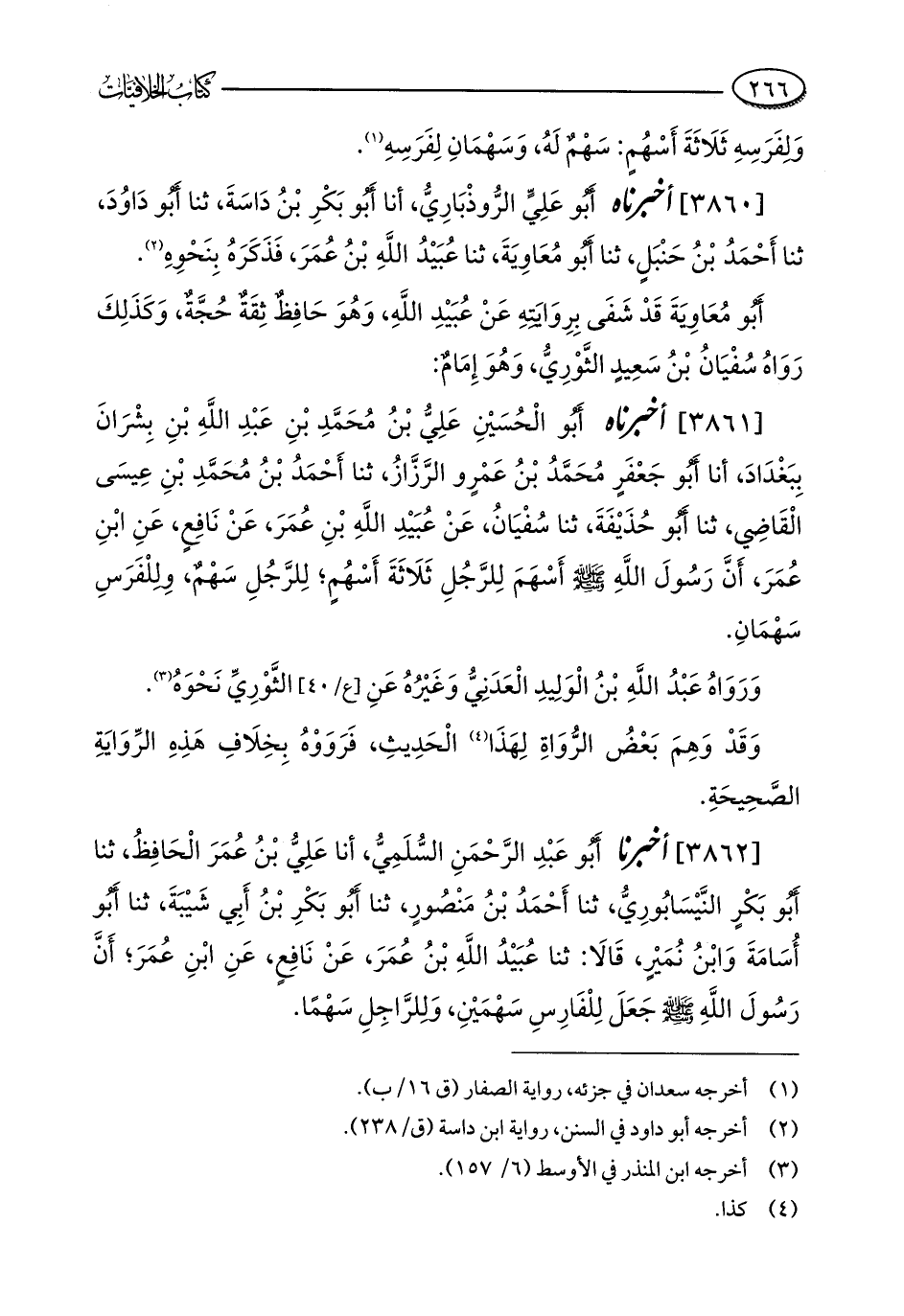 [3862] أخبرنا أبو عَبْدِ الرَّحْمَنِ السُّلَمِيُّ، أنا عَلِيُّ بْنُ عُمَرَ الْحَافِظُ، ثنا أَبُو بَكْر النَّيْسَابُوريُّ، ثنا أَحْمَدُ بْنُ مَنْصُورٍ، ثنا أَبُو بَكْرِ بْنُ أَبي شَيْبَةَ، ثنا أَبُو أُسَامَةَ وَابْنُ نُمَيْرٍ، قَالَا: ثنا عُبَيْدُ اللَّهِ بْنُ عُمَرَ، عَنْ نَافِعٍ، عَنِ ابْنِ عُمَرَ؛ أَنَّ رَسُولَ اللَّهِ - صلى الله عليه وسلم - جعَلَ لِلْفَارِسِ سَهْمَيْنِ، وَلِلرَّاجِلِ سَهْمًا.