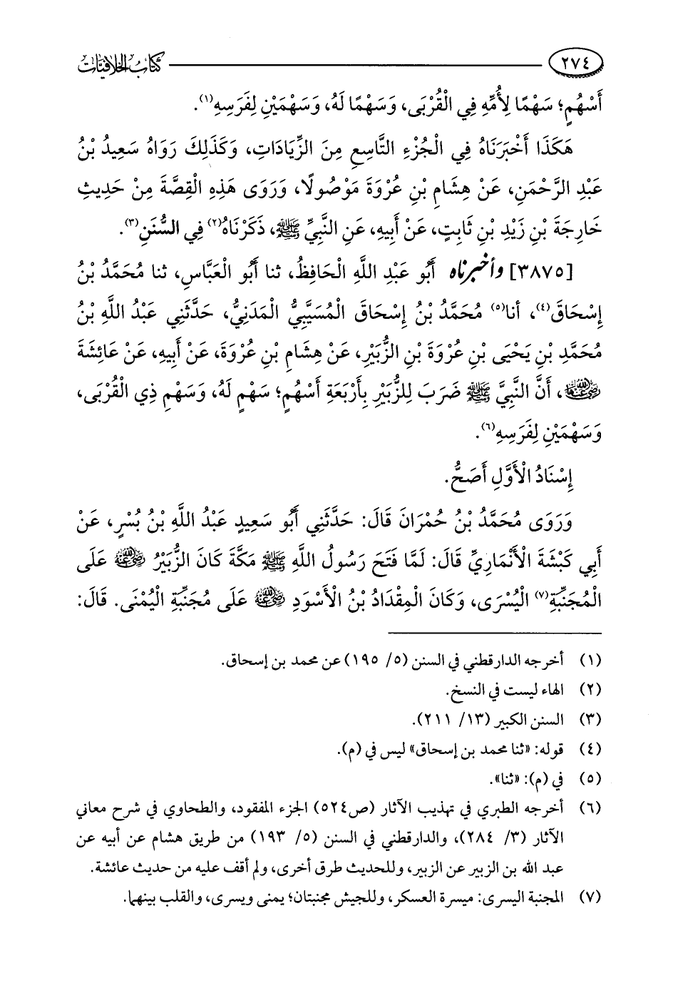 [3875] وأخبرناه أَبُو عَبْدِ اللَّهِ الْحَافِظُ، ثنا أَبُو الْعَبَّاسِ، ثنا مُحَمَّدُ بْنُ إِسْحَاقَ (¬4)، أنا (¬5) مُحَمَّدُ بْنُ إِسْحَاقَ الْمُسَيَّبِيُّ الْمَدَنِيُّ، حَدَّثَنِي عَبْدُ اللَّهِ بْنُ مُحَمَّدِ بْنِ يَحْيَى بْنِ عُرْوَةَ بْنِ الزُّبَيْرِ، عَنْ هِشَامِ بْنِ عُرْوَةَ، عَنْ أَبِيهِ، عَنْ عَائِشَةَ - رضي الله عنها -، أَنَّ النَّبِيَّ - صلى الله عليه وسلم - ضَرَبَ لِلزُّبَيْرِ بِأَرْبَعَةِ أَسْهُمٍ؛ سَهْمٍ لَهُ، وَسَهْمِ ذِي الْقُرْبَى، وَسَهْمَيْنِ لِفَرَسِهِ (¬6).