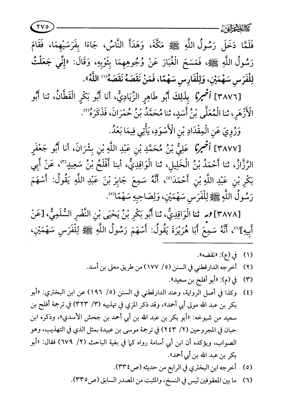 [3877] أخبرنا عَلِيُّ بْنُ مُحَمَّدِ بْنِ عَبْدِ اللَّهِ بْنِ بِشْرَانَ، أنا أَبُو جَعْفَرٍ الرَّزَّازُ، ثنا أَحْمَدُ بْنُ الْخَلِيلِ، ثنا الْوَاقِدِيُّ، أبنا أَفْلَحُ بْنُ سَعِيدٍ (¬3)، عَنْ أَبِي بَكْرِ بْنِ عَبْدِ اللَّهِ بْنِ أَحْمَدَ (¬4)، أَنَّهُ سَمِعَ جَابِرَ بْنَ عَبْدِ اللَّهِ يَقُولُ: أَسْهَمَ رَسُولُ اللَّهِ - صلى الله عليه وسلم - للْفَرَسِ سَهْمَيْنِ، وَلِصَاحِبِهِ سَهْمًا (¬5).