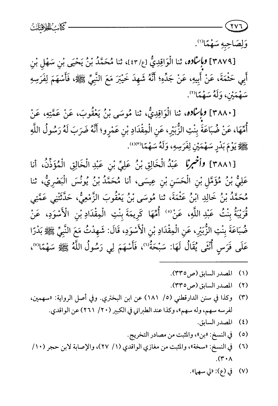 [3880] وبإسناده، ثنا الْوَاقِدِيُّ، ثنا مُوسَى بْنُ يَعْقُوبَ، عَنْ عَمَّتِهِ، عَنْ أُمِّهَا، عَنْ ضُبَاعَةَ بِنْتِ الزُّبَيْرِ، عَنِ الْمِقْدَادِ بْنِ عَمْرٍو؛ أَنَّهُ ضَرَبَ لَهُ رَسُولُ اللَّهِ - صلى الله عليه وسلم - يَوْمَ بَدْرٍ سَهْمَيْنِ لِفَرَسِهِ، وَلَهُ سَهْمًا (¬3) (¬4).