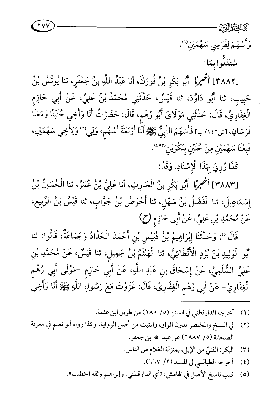 [3882] أخبرنا أَبُو بَكْرِ بْنُ فُورَكَ، أنا عَبْدُ اللَّهِ بْنُ جَعْفَرٍ، ثنا يُونُسُ بْنُ حَبِيبٍ، ثنا أَبُو دَاوُدَ، ثنا قَيْسٌ، حَدَّثَنِي مُحَمَّدُ بْنُ عَلِيٍّ، عَنْ أَبِي حَازِمٍ الْغِفَارِيِّ، قَالَ: حَدَّثَنِي مَوْلَايَ أَبُو رُهْمٍ، قَالَ: حَضَرْتُ أَنَا وَأَخِي حُنَيْنًا وَمَعَنَا فَرَسَانِ، فَأَسْهَمَ النَّبِيُّ - صلى الله عليه وسلم - لَنَا أَرْبَعَةَ أَسْهُمٍ، وَلِي (¬2) وَلِأَخِي سَهْمَيْنِ، فَبِعْنَا سَهْمَيْنِ مِنْ حُنَيْنٍ بِبَكْرَيْنِ (¬3) (¬4).