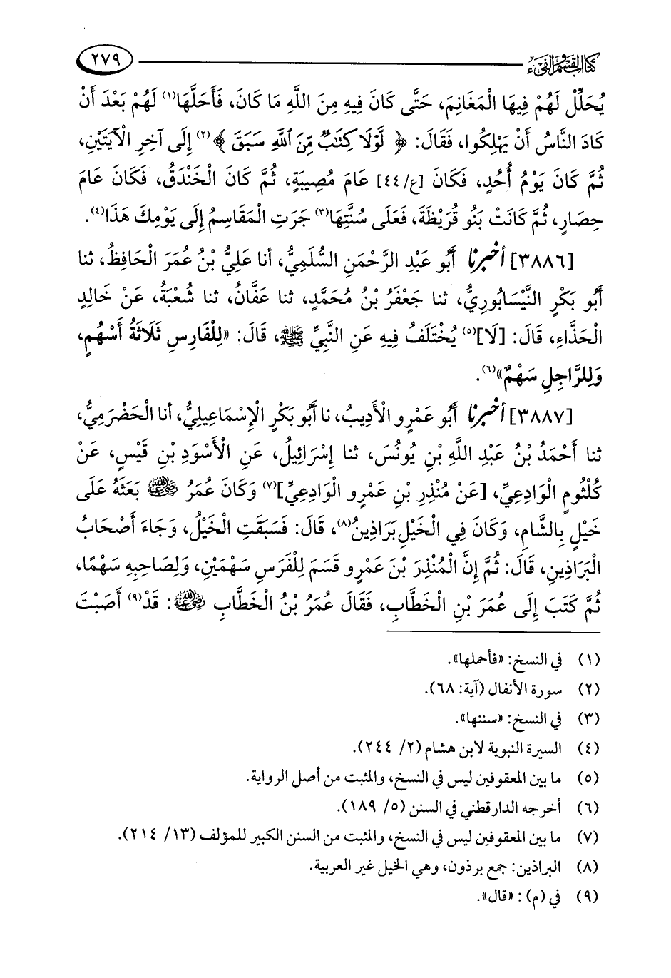 [3886] أخبرنا أَبُو عَبْدِ الرَّحْمَنِ السُّلَمِيُّ، أنا عَلِيُّ بْنُ عُمَرَ الْحَافِظُ، ثنا أَبُو بَكْرٍ النَّيْسَابُورِيُّ، ثنا جَعْفَرُ بْنُ مُحَمَّدٍ، ثنا عَفَّانُ، ثنا شُعْبَةُ، عَنْ خَالِدٍ الْحَذَّاءِ، قَالَ: [لَا] (¬5) يُخْتَلَفُ فِيهِ عَنِ النَّبِيِّ - صلى الله عليه وسلم -، قَالَ: "لِلْفَارِسِ ثَلَاثَةُ أَسْهُمٍ، وَللرَّاجِلِ سَهْمٌ" (¬6).