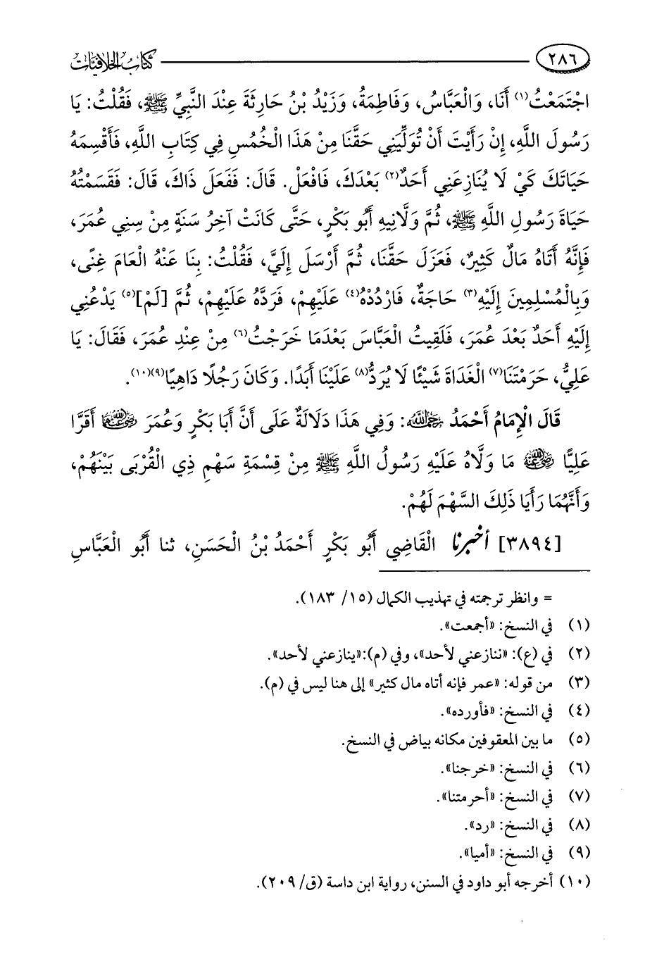 اجْتَمَعْتُ (¬1) أَنَا، وَالْعَبَّاسُ، وَفَاطِمَةُ، وَزَيْدُ بْنُ حَارِثَةَ عِنْدَ النَّبِيِّ - صلى الله عليه وسلم -، فَقُلْتُ: يَا رَسُولَ اللَّهِ، إِنْ رَأَيْتَ أَنْ تُوَلِّيَنِي حَقَّنَا مِنْ هَذَا الْخُمُسِ فِي كِتَابِ اللَّهِ، فَأَقْسِمَهُ حَيَاتَكَ كَيْ لَا يُنَازِعَنِي أَحَدٌ (¬2) بَعْدَكَ، فَافْعَلْ. قَالَ: فَفَعَلَ ذَاكَ، قَالَ: فَقَسَمْتُهُ حَيَاةَ رَسُولِ اللَّهِ - صلى الله عليه وسلم -، ثُمَّ وَلَّانِيهِ أَبُو بَكْرٍ، حَتَّى كَانَتْ آخِرُ سَنَةٍ مِنْ سِنِي عُمَرَ، فَإِنَّهُ أَتَاهُ مَالٌ كَثِيرٌ، فَعَزَلَ حَقَّنَا، ثُمَّ أَرْسَلَ إِلَيَّ، فَقُلْتُ: بِنَا عَنْهُ الْعَامَ غِنًى، وَبِالْمُسْلِمِينَ إِلَيْهِ (¬3) حَاجَةٌ، فَارْدُدْهُ (¬4) عَلَيْهِمْ، فَرَدَّهُ عَلَيْهِمْ، ثُمَّ [لَمْ] (¬5) يَدْعُنِي إِلَيْهِ أَحَدٌ بَعْدَ عُمَرَ، فَلَقِيتُ الْعَبَّاسَ بَعْدَمَا خَرَجْتُ (¬6) مِنْ عِنْدِ عُمَرَ، فَقَالَ: يَا عَلِيُّ، حَرَمْتَنَا (¬7) الْغَدَاةَ شَيْئًا لَا يُرَدُّ (¬8) عَلَيْنَا أَبَدًا. وَكَانَ رَجُلًا دَاهِيًا (¬9) (¬10).