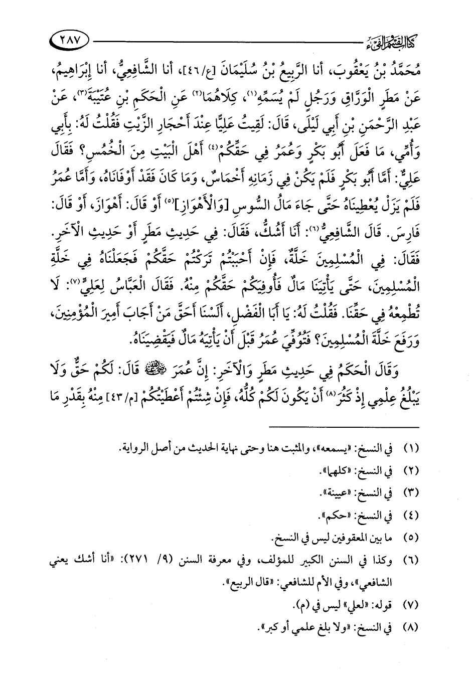 مُحَمَّدُ بْنُ يَعْقُوبَ، أنا الرَّبِيعُ بْنُ سُلَيْمَانَ، أنا الشَّافِعِيُّ، أنا إِبْرَاهِيمُ، عَنْ مَطَرٍ الْوَرَّاقِ وَرَجُلٍ لَمْ يُسَمِّهِ (¬1)، كِلَاهُمَا (¬2) عَنِ الْحَكَمِ بْنِ عُتَيْبَةَ (¬3)، عَنْ عَبْدِ الرَّحْمَنِ بْنِ أَبِي لَيْلَى، قَالَ: لَقِيتُ عَلِيًّا عِنْدَ أَحْجَارِ الزَّيْتِ فَقُلْتُ لَهُ: بِأَبِي وَأُمِّي، مَا فَعَلَ أَبُو بَكْرٍ وَعُمَرُ فِي حَقِّكُمْ (¬4) أَهْلَ الْبَيْتِ مِنَ الْخُمُسِ؟ فَقَالَ عَلِيٌّ: أَمَّا أَبُو بَكْرٍ فَلَمْ يَكُنْ فِي زَمَانِهِ أَخْمَاسٌ، وَمَا كَانَ فَقَدْ أَوْفَانَاهُ، وَأَمَّا عُمَرُ فَلَمْ يَزَلْ يُعْطِينَاهُ حَتَّى جَاءَ مَالُ السُّوسِ [وَالْأَهْوَازِ] (¬5) أَوْ قَالَ: أَهْوَازَ، أَوْ قَالَ: فَارِسَ. قَالَ الشَّافِعِيُّ (¬6): أَنَا أَشُكُّ، فَقَالَ: فِي حَدِيثِ مَطَرٍ أَوْ حَدِيثِ الْآخَرِ. فَقَالَ: فِي الْمُسْلِمِينَ خَلَّةٌ، فَإِنْ أَحْبَبْتُمْ تَرَكْتُمْ حَقَّكُمْ فَجَعَلْنَاهُ فِي خَلَّةِ الْمُسْلِمِينَ، حَتَّى يَأْتِيَنَا مَالٌ فَأُوفِيَكُمْ حَقَّكُمْ مِنْهُ. فَقَالَ الْعَبَّاسُ لِعَلِيٍّ (¬7): لَا تُطْمِعْهُ فِي حَقّنَا. فَقُلْتُ لَهُ: يَا أَبَا الْفَضْلِ، أَلَسْنَا أَحَقَ مَنْ أَجَابَ أَمِيرَ الْمُؤْمِنِينَ، وَرَفَعَ خَلَّةَ الْمُسْلِمِينَ؟ فَتُوُفِّيَ عُمَرُ قَبْلَ أَنْ يَأْتِيَهُ مَالٌ فَيَقْضِيَنَاهُ.