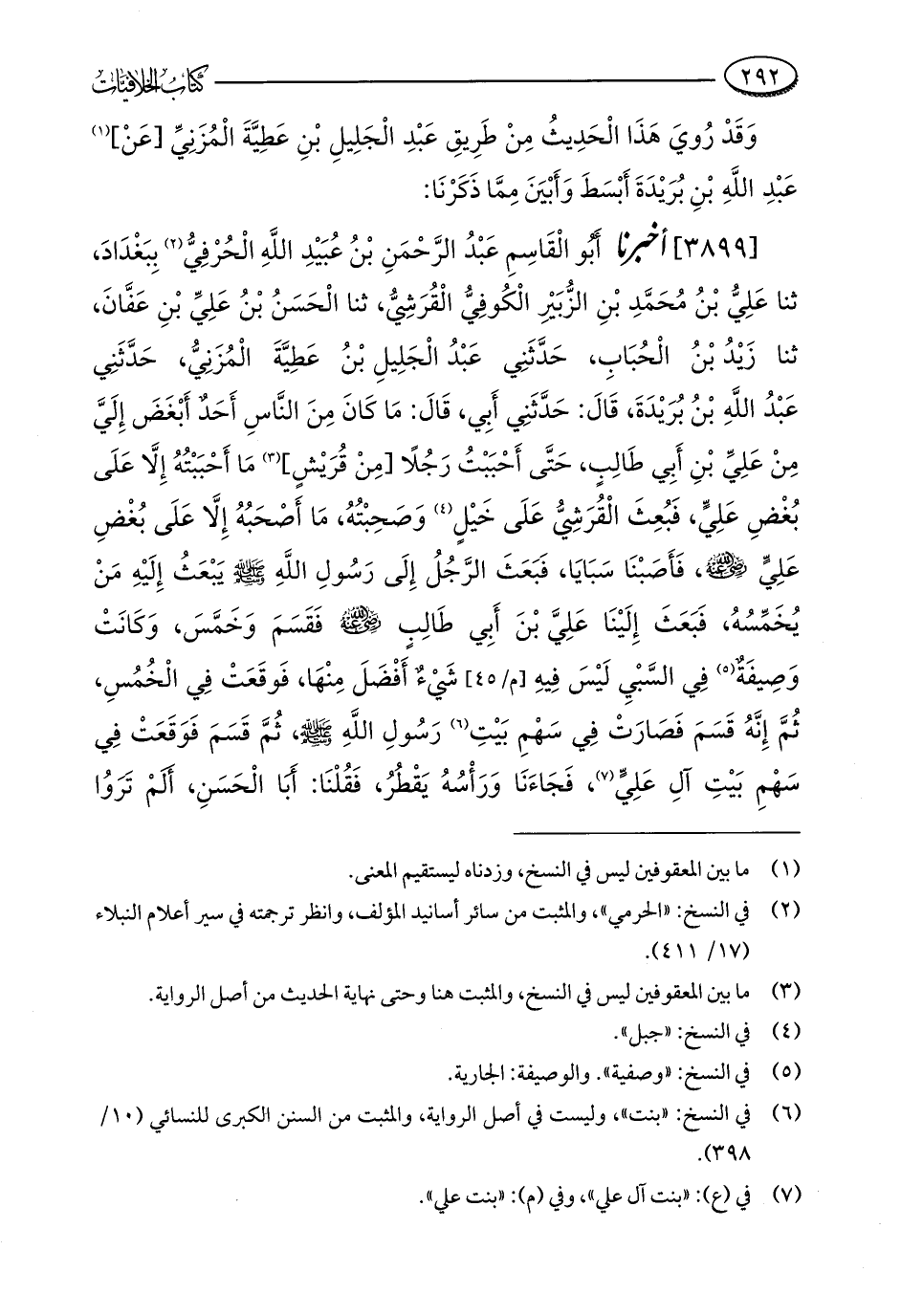 [3899] أخبرنا أَبُو الْقَاسِمِ عَبْدُ الرَّحْمَنِ بْنُ عُبَيْدِ اللَّهِ الْحُرْفِيُّ (¬2) بِبَغْدَادَ، ثنا عَلِيُّ بْنُ مُحَمَّدِ بْنِ الزُّبَيْرِ الْكُوفِيُّ الْقُرَشِيُّ، ثنا الْحَسَنُ بْنُ عَلِيِّ بْنِ عَفَّانَ، ثنا زَيْدُ بْنُ الْحُبَابِ، حَدَّثَنِي عَبْدُ الْجَلِيلِ بْنُ عَطِيَّةَ الْمُزَنِيُّ، حَدَّثَنِي عَبْدُ اللَّهِ بْنُ بُرَيْدَةَ، قَالَ: حَدَّثَنِي أَبِي، قَالَ: مَا كَانَ مِنَ النَّاسِ أَحَدٌ أَبْغَضَ إِلَيَّ مِنْ عَلِيِّ بْنِ أَبِي طَالِبٍ، حَتَّى أَحْبَبْتُ رَجُلًا [مِنْ قُرَيْشٍ] (¬3) مَا أَحْبَبْتُهُ إِلَّا عَلَى بُغْضِ عَلِيٍّ، فَبُعِثَ الْقُرَشِيُّ عَلَى خَيْلٍ (¬4) وَصَحِبْتُهُ، مَا أَصْحَبُهُ إِلَّا عَلَى بُغْضِ عَلِيٍّ - رضي الله عنه -، فَأَصَبْنَا سَبَايَا، فَبَعَثَ الرَّجُلُ إِلَى رَسُولِ اللَّهِ - صلى الله عليه وسلم - يَبْعَثُ إِلَيْهِ مَنْ يُخَمِّسُهُ، فَبَعَثَ إِلَيْنَا عَلِيَّ بْنَ أَبِي طَالِبٍ - رضي الله عنه - فَقَسَمَ وَخَمَّسَ، وَكَانَتْ وَصِيفَةٌ (¬5) فِي السَّبْيِ لَيْسَ فِيهِ شَيْءٌ أَفْضَلَ مِنْهَا، فَوقَعَتْ فِي الْخُمُسِ، ثُمَّ إِنَّهُ قَسَمَ فَصَارَتْ فِي سَهْمِ بَيْتِ (¬6) رَسُولِ اللَّهِ - صلى الله عليه وسلم -، ثُمَّ قَسَمَ فَوَقَعَتْ فِي سَهْمِ بَيْتِ آلِ عَلِيٍّ (¬7)، فَجَاءَنَا وَرَأْسُهُ يَقْطُرُ، فَقُلْنَا: أَبَا الْحَسَنِ، أَلَمْ تَرَوُا