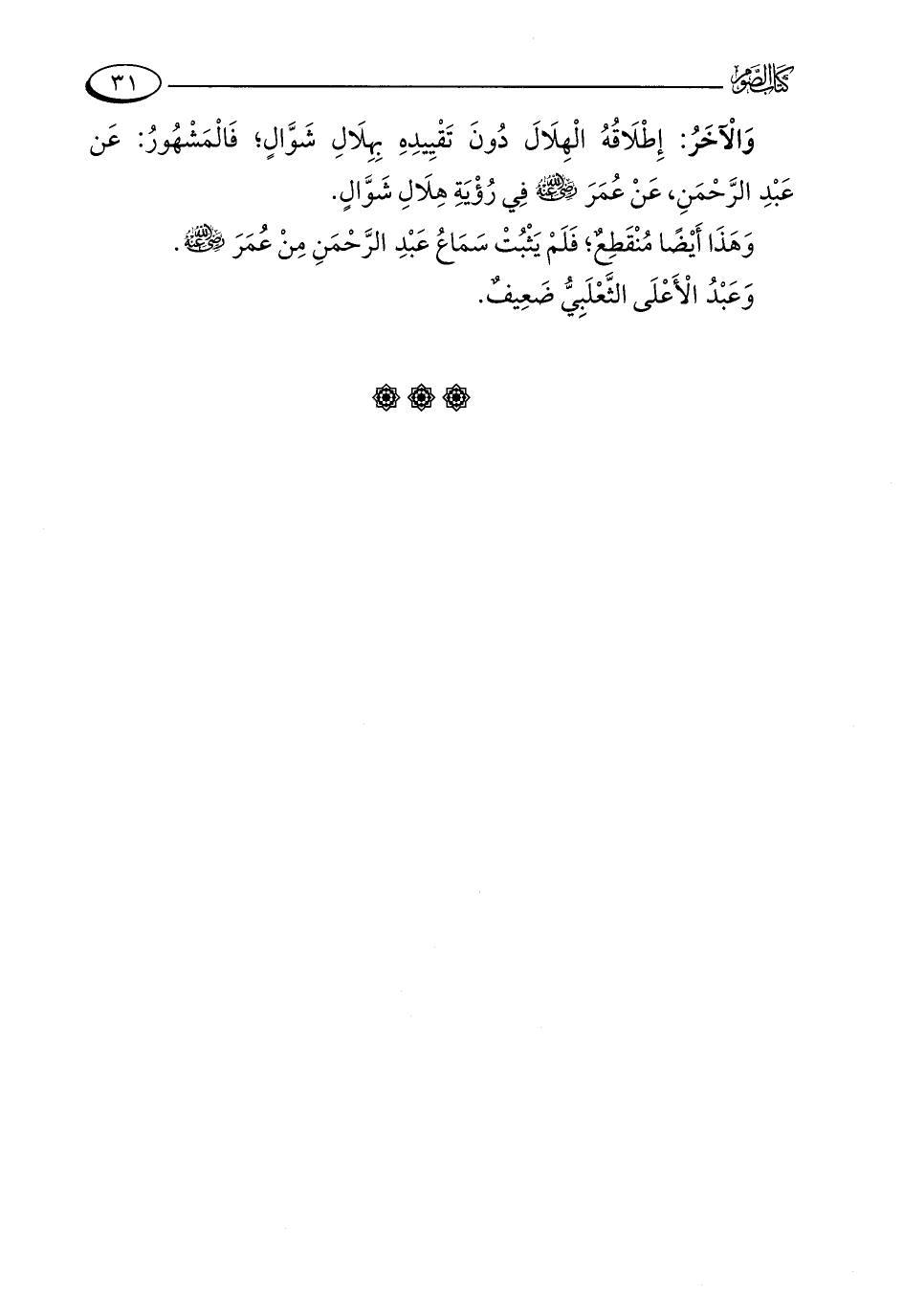 وَالْآخَرُ: إِطْلَاقُهُ الْهِلَالَ دُونَ تَقْيِيدِهِ بِهِلَالِ شَوَّالٍ؛ فَالْمَشْهُورُ: عَن عَبْدِ الرَّحْمَنِ، عَنْ عُمَرَ - رضي الله عنه - فِي رُؤْيَةِ هِلَالِ شَوَّالٍ.