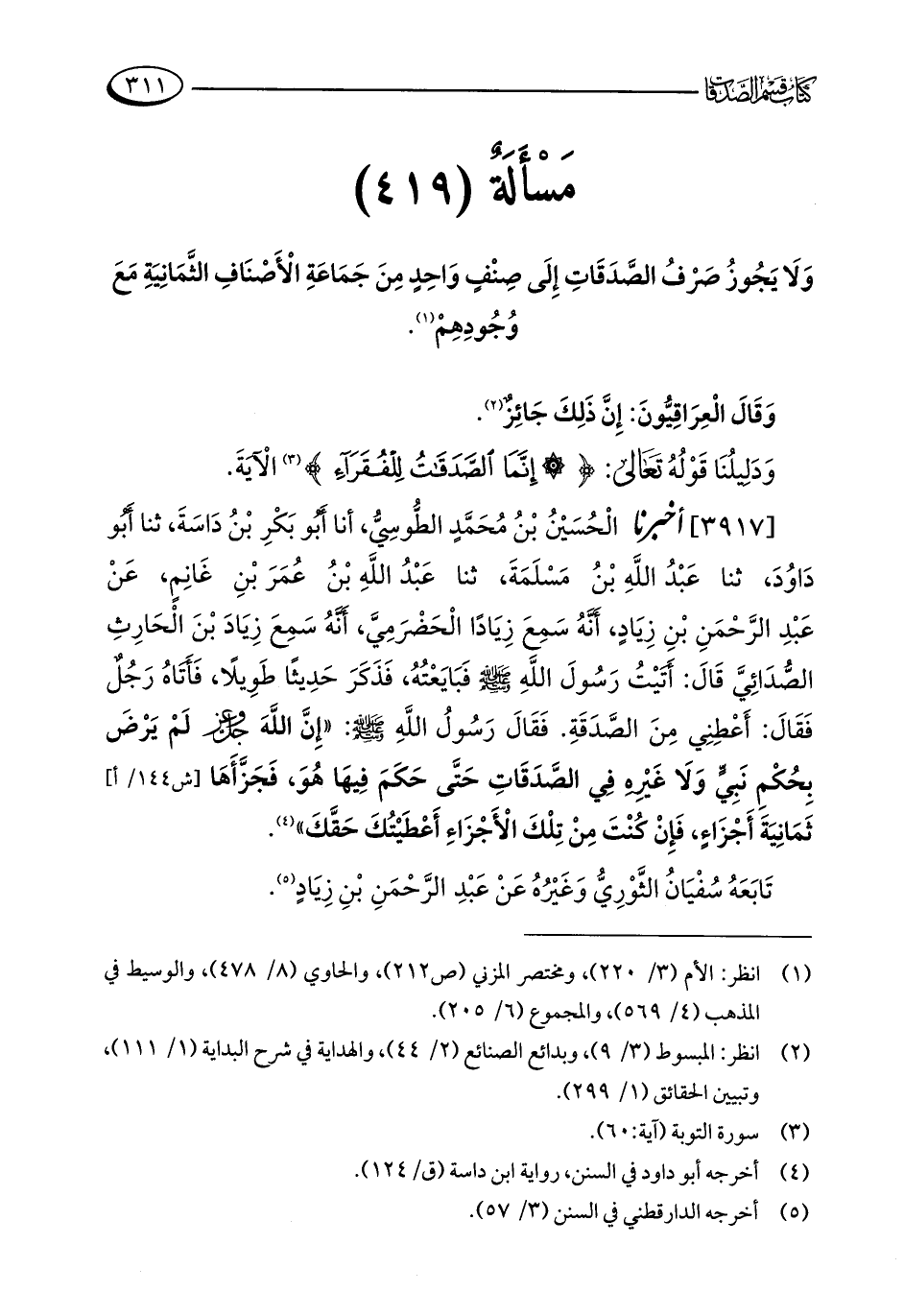 مَسْأَلَةٌ (419): وَلَا يَجُوزُ صَرْفُ الصَّدَقَاتِ إِلَى صِنْفٍ وَاحِدٍ مِنَ جَمَاعَةِ الْأَصْنَافِ الثَّمَانِيَةِ مَعَ وُجُودِهِمْ (¬1).