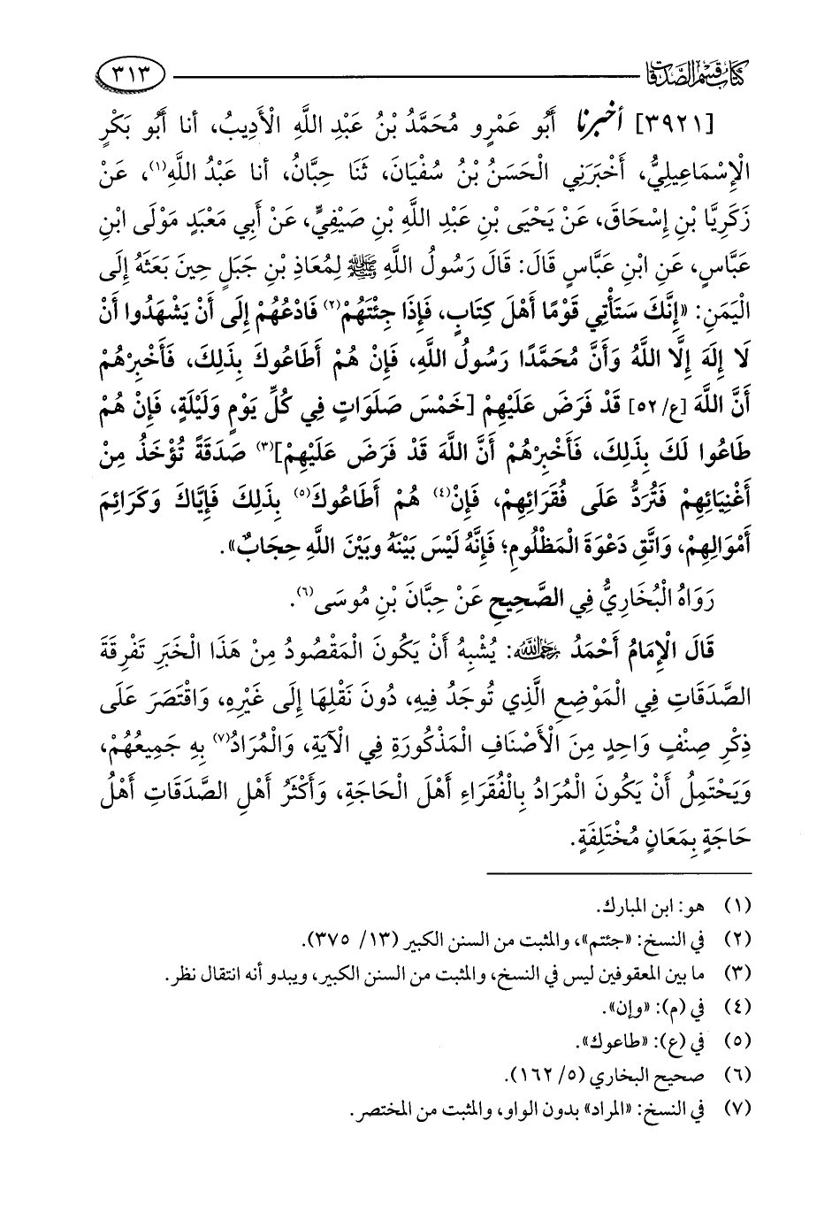 [3921] أخبرنا أَبُو عَمْرٍو مُحَمَّدُ بْنُ عَبْدِ اللَّهِ الْأَدِيبُ، أنا أَبُو بَكْرٍ الْإِسْمَاعِيلِيُّ، أَخْبَرَنِي الْحَسَنُ بْنُ سُفْيَانَ، ثَنَا حِبَّانُ، أنا عَبْدُ اللَّهِ (¬1)، عَنْ زَكَرِيَّا بْنِ إِسْحَاقَ، عَنْ يَحْيَى بْنِ عَبْدِ اللَّهِ بْنِ صَيْفِيٍّ، عَنْ أَبِي مَعْبَدٍ مَوْلَى ابْنِ عَبَّاسٍ، عَنِ ابْنِ عَبَّاسٍ قَالَ: قَالَ رَسُولُ اللَّهِ - صلى الله عليه وسلم - لِمُعَاذِ بْنِ جَبَلٍ حِينَ بَعَثَهُ إِلَى الْيَمَنِ: "إِنَّكَ سَتَأْتِي قَوْمًا أَهْلَ كِتَابٍ، فَإِذَا جِئْتَهُمْ (¬2) فَادْعُهُمْ إِلَى أَنْ يَشْهَدُوا أَنْ لَا إِلَهَ إِلَّا اللَّهُ وَأَنَّ مُحَمَّدًا رَسُولُ اللَّهِ، فَإِنْ هُمْ أَطَاعُوكَ بِذَلِكَ، فَأَخْبِرْهُمْ أَنَّ اللَّهَ قَدْ فَرَضَ عَلَيْهِمْ [خَمْسَ صَلَوَاتٍ فِي كُلِّ يَوْمٍ وَلَيْلَةٍ، فَإِنْ هُمْ طَاعُوا لَكَ بِذَلِكَ، فَأَخْبِرْهُمْ أَنَّ اللَّهَ قَدْ فَرَضَ عَلَيْهِمْ] (¬3) صَدَقَةً تُؤْخَذُ مِنْ أَغْنِيَائِهِمْ فَتُرَدُّ عَلَى فُقَرَائِهِمْ، فَإِنْ (¬4) هُمْ أَطَاعُوكَ (¬5) بِذَلِكَ فَإِيَّاكَ وَكَرَائِمَ أَمْوَالِهِمْ، وَاتَّقِ دَعْوَةَ الْمَظْلُومِ؛ فَإِنَّهُ لَيْسَ بَيْنه وبَيْنَ اللَّهِ حِجَابٌ".