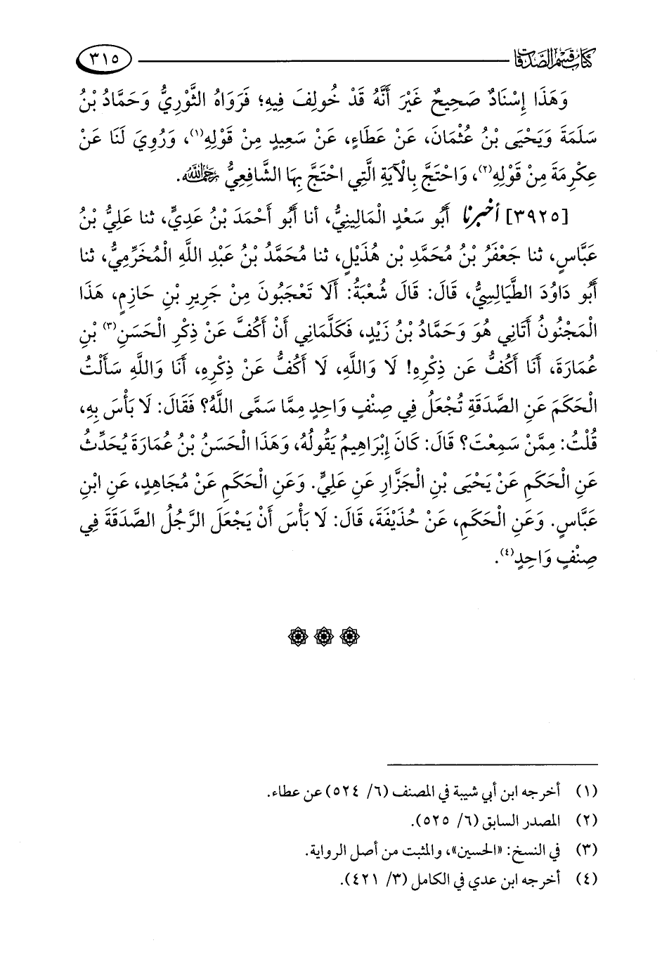 [3925] أخبرنا أَبُو سَعْدٍ الْمَالِينِيُّ، أنا أَبُو أَحْمَدَ بْنُ عَدِيٍّ، ثنا عَلِيُّ بْنُ عَبَّاسٍ، ثنا جَعْفَرُ بْنُ مُحَمَّدِ بْن هُذَيْلٍ، ثنا مُحَمَّدُ بْنُ عَبْدِ اللَّهِ الْمُخَرِّمِيُّ، ثنا أَبُو دَاوُدَ الطَّيَالِسِيُّ، قَالَ: قَالَ شُعْبَةُ: أَلَا تَعْجَبُونَ مِنْ جَرِيرِ بْنِ حَازِمٍ، هَذَا الْمَجْنُونُ أَتَانِي هُوَ وَحَمَّادُ بْنُ زَيْدٍ، فَكَلَّمَانِي أَنْ أَكُفَّ عَنْ ذِكْرِ الْحَسَنِ (¬3) بْنِ عُمَارَةَ، أَنَا أَكُفُّ عَن ذِكْرِهِ! لَا وَاللَّهِ، لَا أَكُفُّ عَنْ ذِكْرِهِ، أَنَا وَاللَّهِ سَأَلْتُ الْحَكَمَ عَنِ الصَّدَقَةِ تُجْعَلُ فِي صِنْفٍ وَاحِدٍ مِمَّا سَمَّى اللَّهُ؟ فَقَالَ: لَا بَأْسَ بِهِ، قُلْتُ: مِمَّنْ سَمِعْتَ؟ قَالَ: كَانَ إِبْرَاهِيمُ يَقُولُهُ، وَهَذَا الْحَسَنُ بْنُ عُمَارَةَ يُحَدِّثُ عَنِ الْحَكَمِ عَنْ يَحْيَى بْنِ الْجَزَّارِ عَنِ عَلِيٍّ. وَعَنِ الْحَكَمِ عَنْ مُجَاهِدٍ، عَنِ ابْنِ عَبَّاسٍ. وَعَنِ الْحَكَمِ، عَنْ حُذَيْفَةَ، قَالَ: لَا بَأْسَ أَنْ يَجْعَلَ الرَّجُلُ الصَّدَقَةَ فِي صِنْفٍ وَاحِدٍ (¬4).