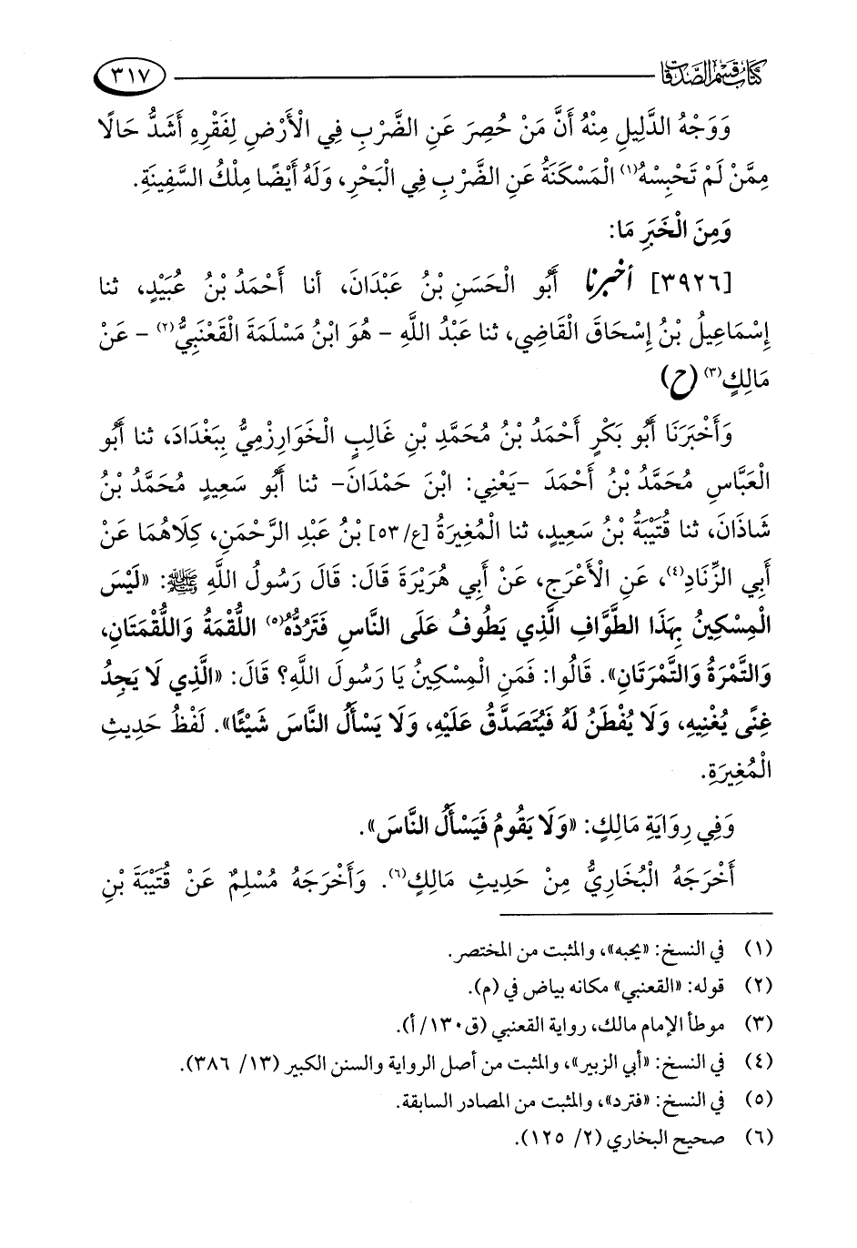 وَأَخْبَرَنَا أَبُو بَكْرٍ أَحْمَدُ بْنُ مُحَمَّدِ بْنِ غَالِبٍ الْخَوَارِزْمِيُّ بِبَغْدَادَ، ثنا أَبُو الْعَبَّاسِ مُحَمَّدُ بْنُ أَحْمَدَ - يَعْنِي: ابْنَ حَمْدَانَ - ثنا أَبُو سَعِيدٍ مُحَمَّدُ بْنُ شَاذَانَ، ثنا قُتَيْبَةُ بْنُ سَعِيدٍ، ثنا الْمُغِيرَةُ بْنُ عَبْدِ الرَّحْمَنِ، كِلَاهُمَا عَنْ أَبِي الزِّنَادِ (¬4)، عَنِ الْأَعْرَجِ، عَنْ أَبِي هُرَيْرَةَ قَالَ: قَالَ رَسُولُ اللَّهِ - صلى الله عليه وسلم -: "لَيْسَ الْمِسْكِينُ بِهَذَا الطَّوَّافِ الَّذِي يَطُوفُ عَلَى النَّاسِ فَتَرُدُّهُ (¬5) اللُّقْمَةُ وَاللُّقْمَتَانِ، وَالتَّمْرَةُ وَالتَّمْرَتَانِ". قَالُوا: فَمَنِ الْمِسْكِينُ يَا رَسُولَ اللَّهِ؟ قَالَ: "الَّذِي لَا يَجِدُ غِنًى يُغْنِيهِ، وَلَا يُفْطَنُ لَهُ فَيُتَصَدَّقُ عَلَيْهِ، وَلَا يَسْأَلُ النَّاسَ شَيْئًا". لَفْظُ حَدِيثِ الْمُغِيرَةِ.
