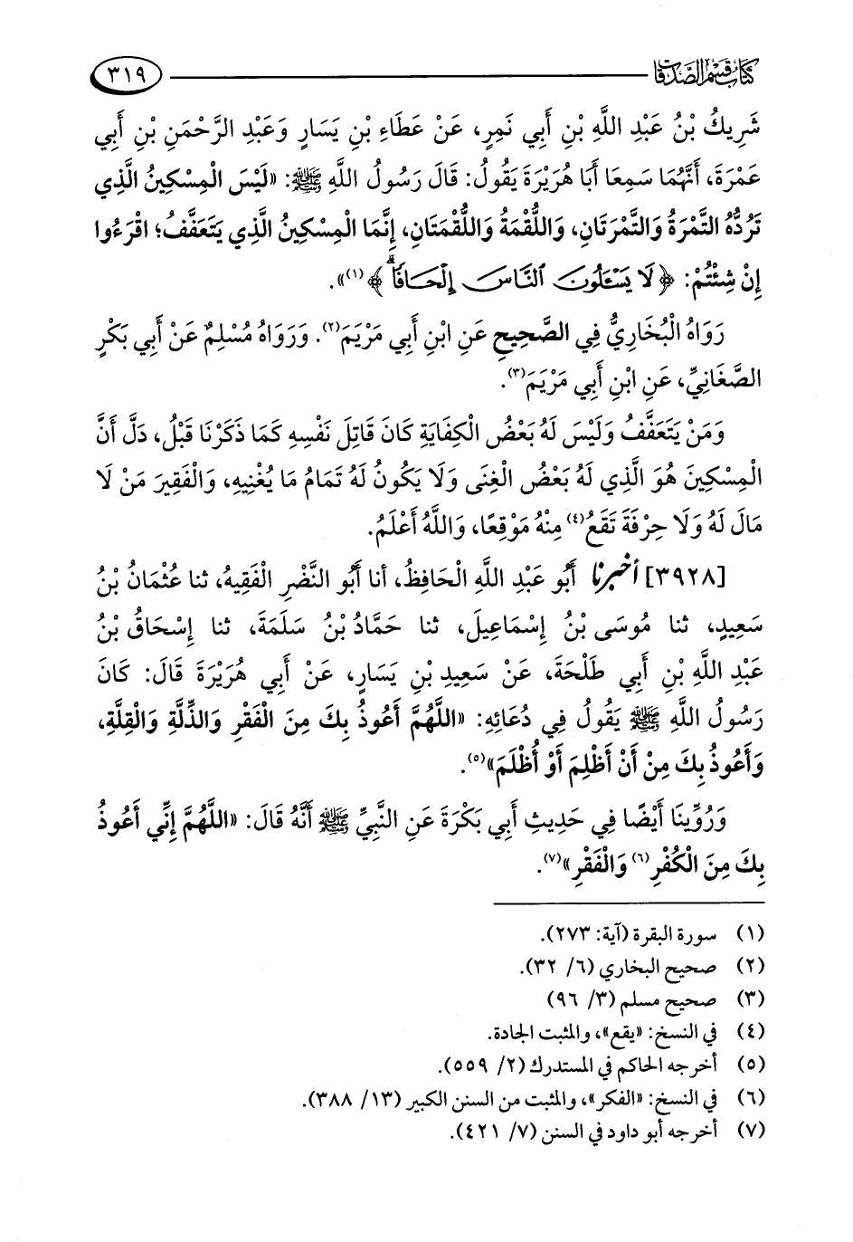 [3928] أخبرنا أَبُو عَبْدِ اللَّهِ الْحَافِظُ، أنا أَبُو النَّضْرِ الْفَقِيهُ، ثنا عُثْمَانُ بْنُ سَعِيدٍ، ثنا مُوسَى بْنُ إِسْمَاعِيلَ، ثنا حَمَّادُ بْنُ سَلَمَةَ، ثنا إِسْحَاقُ بْنُ عَبْدِ اللَّهِ بْنِ أَبِي طَلْحَةَ، عَنْ سَعِيدِ بْنِ يَسَارٍ، عَنْ أَبِي هُرَيْرَةَ قَالَ: كَانَ رَسُولُ اللَّهِ - صلى الله عليه وسلم - يَقُولُ فِي دُعَائِهِ: "اللَّهُمَّ أَعُوذُ بِكَ مِنَ الْفَقْرِ وَالذِّلَّةِ وَالْقِلَّةِ، وَأَعُوذُ بِكَ مِنْ أَنْ أَظْلِمَ أَوْ أُظْلَمَ" (¬5).