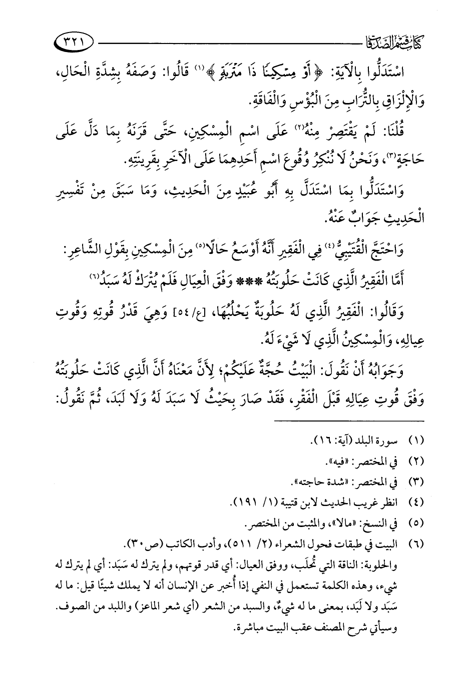 وَاحْتَجَّ الْقُتَيْبِيُّ (¬4) فِي الْفَقِيرِ أَنَّهُ أَوْسَعُ حَالًا (¬5) مِنَ الْمِسْكِينِ بِقَوْلِ الشَّاعِرِ: