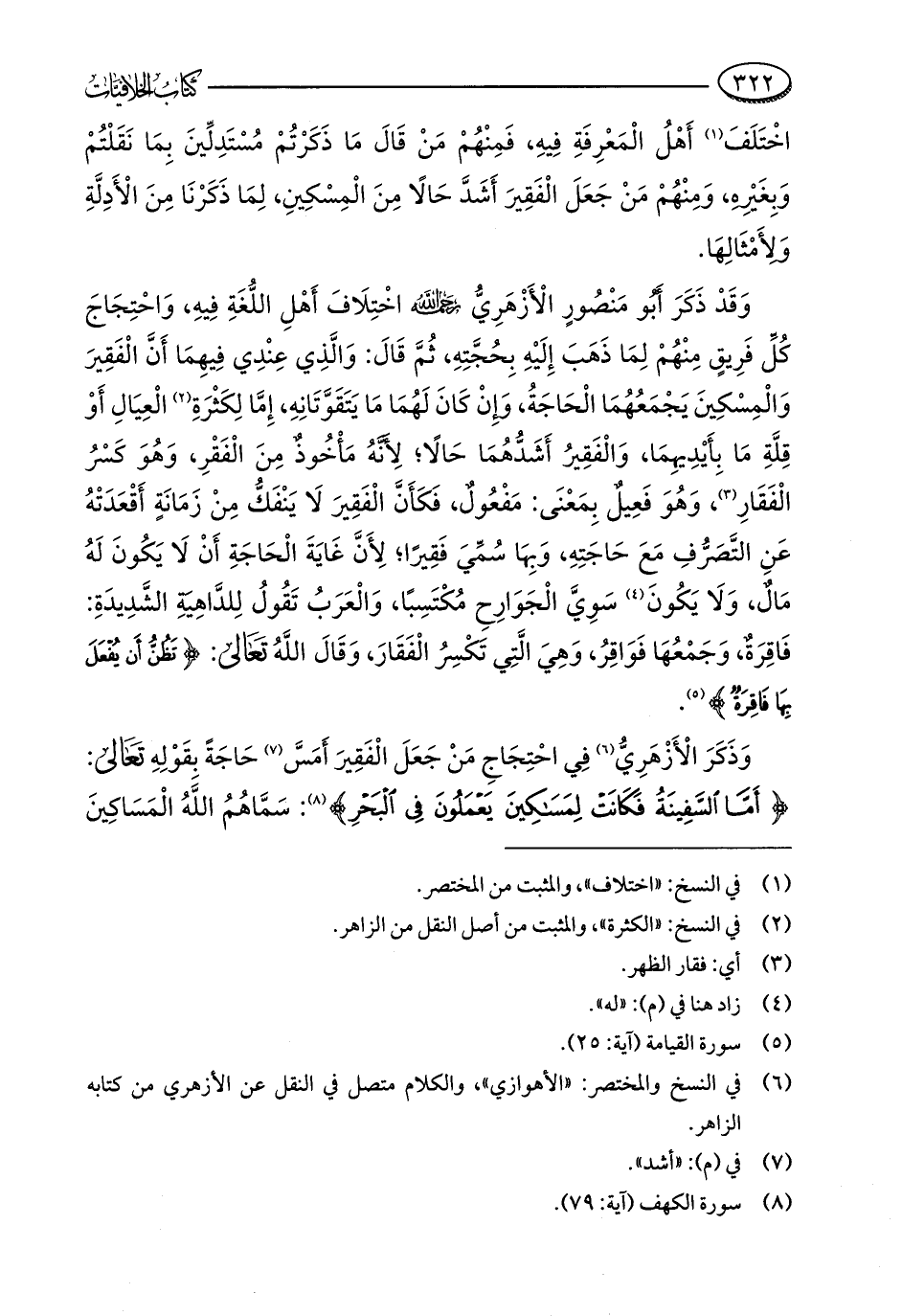 وَقَدْ ذَكَرَ أَبُو مَنْصُورٍ الْأَزْهَرِيُّ - رحمه الله - اخْتِلَافَ أَهْلِ اللُّغَةِ فِيهِ، وَاحْتِجَاجَ كُل فَرِيقٍ مِنْهُمْ لِمَا ذَهَبَ إِلَيْهِ بِحُجَّتِهِ، ثُمَّ قَالَ: وَالَّذِي عِنْدِي فِيهِمَا أَنَّ الْفَقِيرَ وَالْمِسْكِينَ يَجْمَعُهُمَا الْحَاجَةُ، وَإِنْ كَانَ لَهُمَا مَا يَتَقَوَّتَانِهِ، إِمَّا لِكَثْرَةِ (¬2) الْعِيَالِ أَوْ قِلَّةِ مَا بِأَيْدِيهِمَا، وَالْفَقِيرُ أَشَدُّهُمَا حَالًا؛ لِأَنَّهُ مَأْخُوذٌ مِنَ الْفَقْرِ، وَهُوَ كَسْرُ الْفَقَارِ (¬3)، وَهُوَ فَعِيلٌ بِمَعْنَى: مَفْعُولٌ، فَكَأَنَّ الْفَقِيرَ لَا يَنْفَكُّ مِنْ زَمَانَةٍ أَقْعَدَتْهُ عَنِ التَّصَرُّفِ مَعَ حَاجَتِهِ، وَبِهَا سُمِّيَ فَقِيرًا؛ لِأَنَّ غَايَةَ الْحَاجَةِ أَنْ لَا يَكُونَ لَهُ مَالٌ، وَلَا يَكُونَ (¬4) سَوِيَّ الْجَوَارِحِ مُكْتَسِبًا، وَالْعَرَبُ تَقُولُ لِلدَّاهِيَةِ الشَّدِيدَةِ: فَاقِرَةٌ، وَجَمْعُهَا فَوَاقِرُ، وَهِيَ الَّتِي تَكْسِرُ الْفَقَارَ، وَقَالَ اللَّهُ تَعَالى: {تَظُنُّ أَنْ يُفْعَلَ بِهَا فَاقِرَةٌ} (¬5).