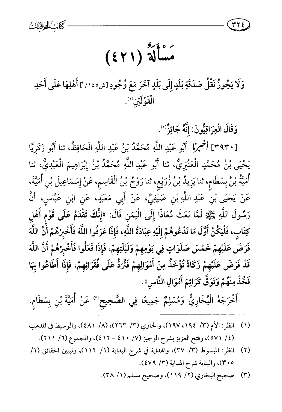 مَسْأَلَةٌ (421): وَلَا يَجُوزُ نَقْلُ صَدَقَةِ بَلَدٍ إِلَى بَلَدٍ آخَرَ مَعَ وُجُودِ أَهْلِهَا عَلَى أَحَدِ الْقَوْلَيْنِ (¬1).